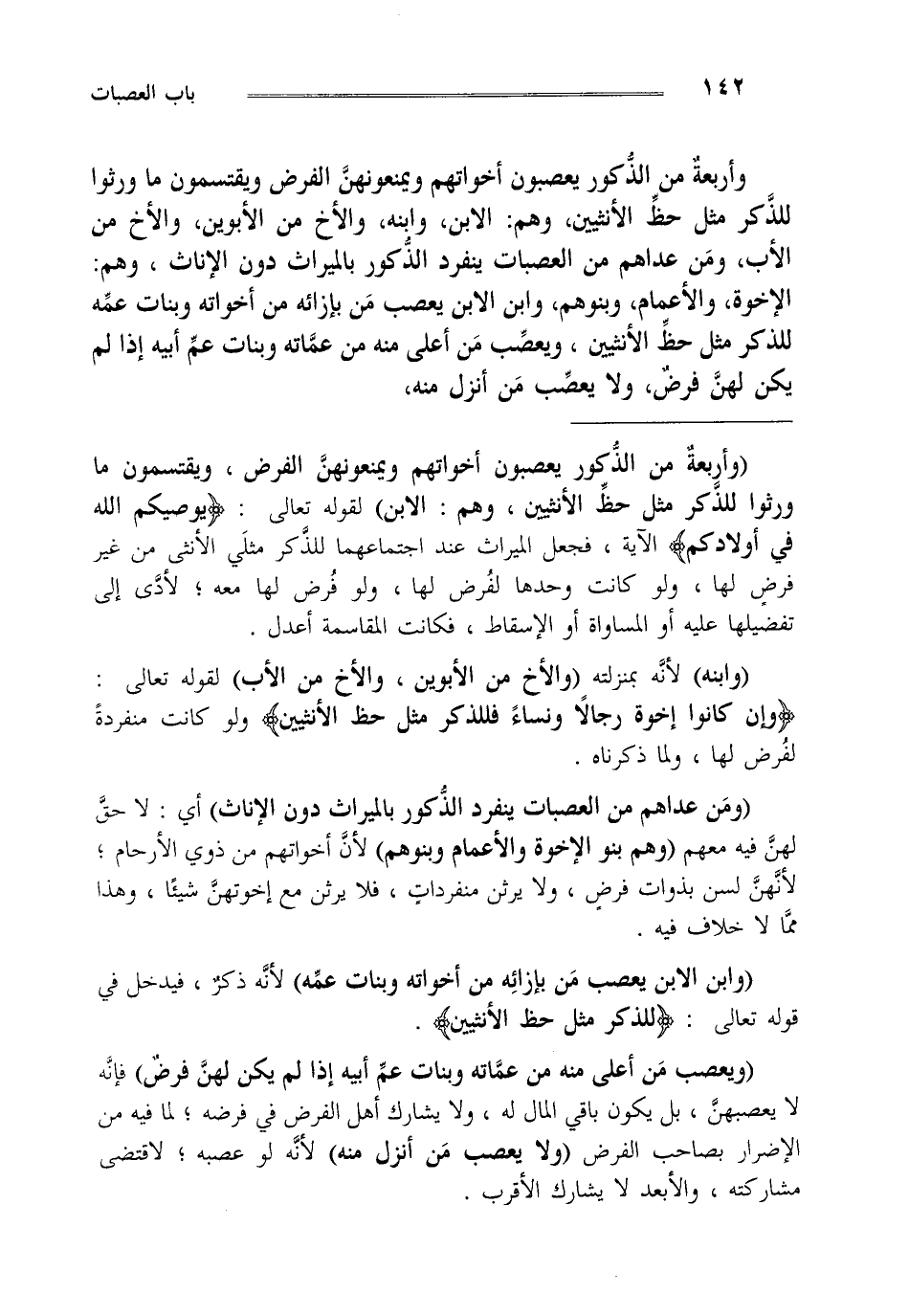 وأربعة من الذكور يعصبون أخواتهم ويمنعونهن الفرض ويقتسمون ما ورثوا للذكر مثل حظ الأنثيين وهم الابن وابنه والأخ من الأبوين والأخ من الأب ومن عداهم من العصبات ينفرد الذكور بالميراث وهم الإخوة والأعمام وبنوهم وابن الابن يعصب من بإزائه من أخواته وبنات عمه للذكر مثل حظ الأنثيين ويعصب من أعلى منه من عماته وبنات عم أبيه إذا لم يكن لهن فرض ولا يعصب من أنزل منه،