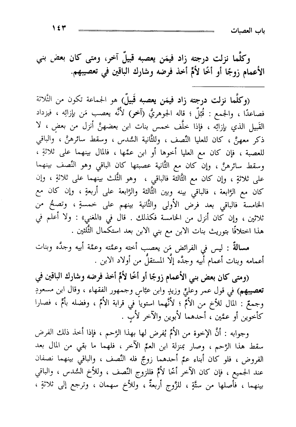 وكلما نزلت درجته زاد فيمن يعصبه قبيل آخر ومتى كان بعض بني الأعمام زوجاً أو أخاً لأم أخذ فرضه وشارك الباقين في تعصيبهم.