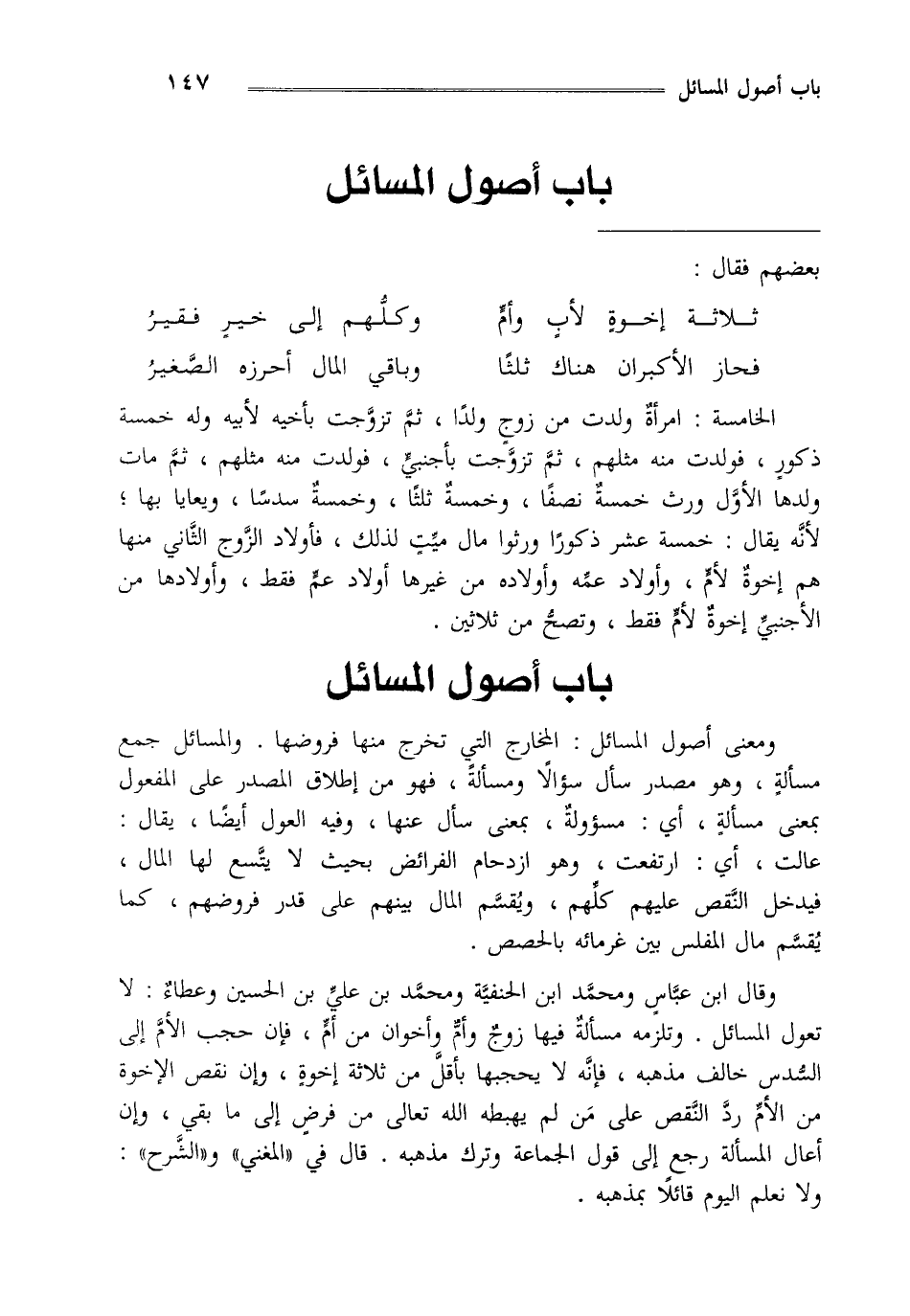 ومعنى أصول المسائل المخارج التي تخرج منها فروضها والمسائل جمع مسألة: وهو مصدر سأل سؤالا ومسألة فهو من إطلاق المصدرعلى المفعول بمعنى مسألة: أي: مسؤولة بمعنى سأل عنها وفيه العول أيضا يقال عالت أي: ارتفعت وهو ازدحام الفرائض بحيث لا يتسع لها المال فيدخل النقص عليهم كلهم ويقسم المال بينهم على قدر فروضهم كما يقسم مال المفلس بين غرمائه بالحصص.