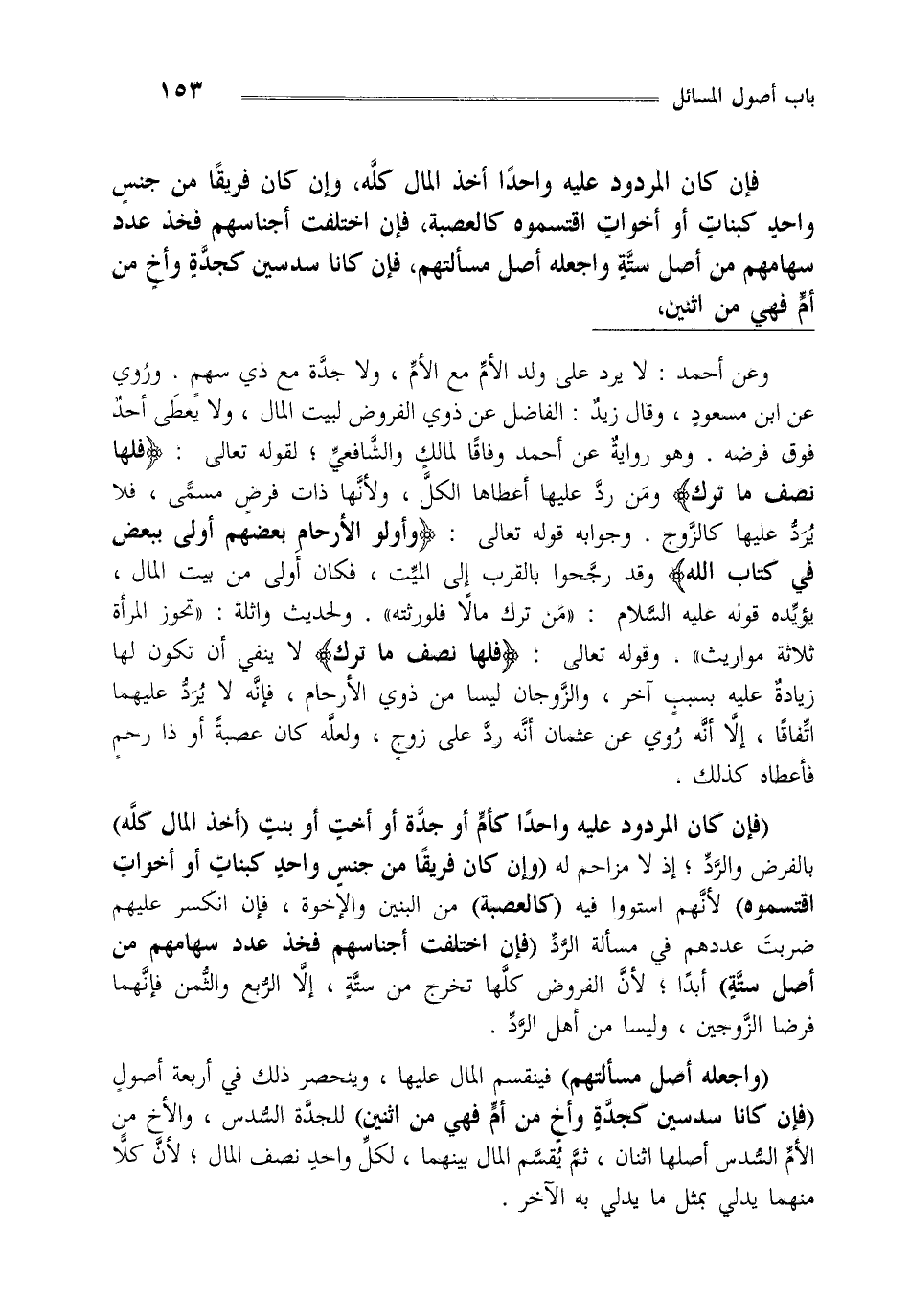 "فإن كان المردود عليه واحدا كأم أو جدة أو أخت أو بنت أخذ المال كله" بالفرض والرد إذ لا مزاحم له "وإن كان فريقا من جنس واحد كبنات أو أخوات اقتسموه" لأنهم استووا فيه "كالعصبة" من البنين والإخوة فإن انكسر عليهم ضربت عددهم في مسألة الرد "فإن اختلفت أجناسهم فخذ عدد سهامهم من أصل ستة" أبدا لأن الفروض كلها تخرج من ستة إلا الربع والثمن فإنهما فرضا الزوجين وليسا من أهل الرد.
