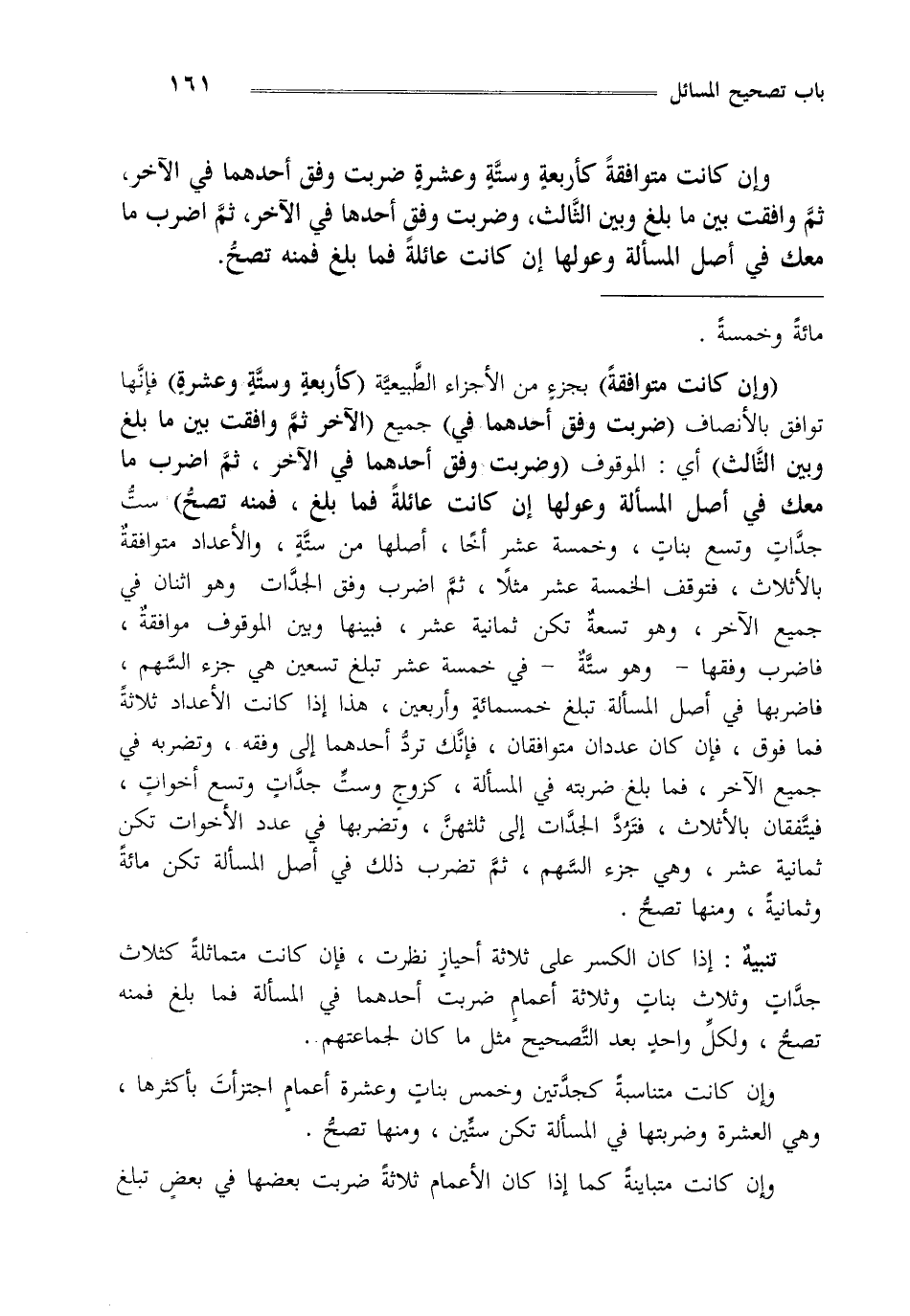 "وإن كانت متوافقة" بجزء من الأجزاء الطبيعية "كأربعة وستة وعشرة" فإنها توافق بالأنصاف "ضربت وفق أحدهما في" جميع "الآخر ثم وافقت بين ما بلغ وبين الثالث" أي: الموقوف "وضربت وفق أحدهما في الآخر ثم اضرب ما معك في أصل المسألة وعولها إن كانت عائلة فما بلغ فمنه تصح" ست جدات وتسع بنات وخمسة عشر أخا أصلها من ستة والأعداد متوافقة بالأثلاث فتوقف الخمسة عشر مثلا ثم اضرب وفق الجدات وهو اثنان في جميع الآخر وهو تسعة تكن ثمانية عشر فبينها وبين الموقوف موافقة فاضرب وفقها وهو ستة في خمسة عشر تبلغ تسعين هي جزء السهم فاضربها في أصل المسألة تبلغ خمسمائة وأربعين هذا إذا كانت الأعداد ثلاثة فما فوق فإن كان عددان متوافقان فإنك ترد أحدهما إلى وفقه وتضربه في جميع الآخر فما بلغ ضربته في المسألة كزوج وست جدات وتسع أخوات فيتفقان بالأثلاث فترد الجدات إلى ثلثهن وتضربها في عدد الأخوات تكن ثمانية عشر وهي جزء السهم ثم تضرب ذلك في أصل المسألة تكن مائة وثمانية ومنها تصح.
