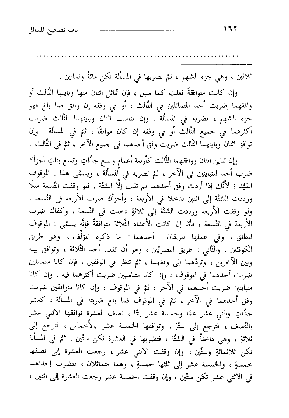 وإن تباين اثنان ووافقهما الثالث كأربعة أعمام وسبع جدات وتسع بنات أجزأك ضرب أحد المتباينين في الآخر ثم تضربه في المسألة ويسمى هذا الموقوف المقيد لأنك إذا أردت وفق أحدهما لم تقف إلاالستة فلو وقفت التسعة مثلا ورددت الستة إلى اثنين لدخلا في الأربعة وأجزاك ضرب الأربعة في التسعة ولو وقفت الأربعة ورددت الستة إلى ثلاثة دخلت في التسعة وكفاك ضرب الأربعة في التسعة فأما إن كانت الأعداد الثلاثة متوافقة فإنه يسمى الموقوف المطلق وفي عملها طريقان أحدهما ما ذكره المؤلف وهو طريق الكوفيين والثاني: طريق البصريين وهو أن تقف أحد الثلاثة وتوافق بينه وبين الآخرين وتردهما إلى وفقهما ثم تنظر في الوفقين فإن كانا متماثلين ضربت أحدهما في الموقوف وإن كانا متناسبين ضربت أكثرهما فيه وإن كانا متباينين ضربت أحدهما في الآخر ثم في الموقوف وإن كانا متوافقين ضربت وفق أحدهما في الآخر ثم في الموقوف فما بلغ ضربته في المسألة كعشر جدات واثني عشر عما وخمسة عشر بنتا نصف العشرة توافقها الإثني عشر بالنصف فترجع إلى ستة وتوافقها الخمسة عشر بالأخماس فترجع إلى ثلاثة وهي داخلة في الستة فتضربها في العشرة تكن ستين ثم في المسألة تكن ثلاثمائة وستين وإن وقفت الإثني عشر رجعت العشرة إلى نصفها خمسة والخمسة عشر إلىثلثها خمسة وهما متماثلان فتضرب إحداهما في الاثني عشر تكن ستين وإن وقفت الخمسة عشر رجعت العشرة إلى اثنين،