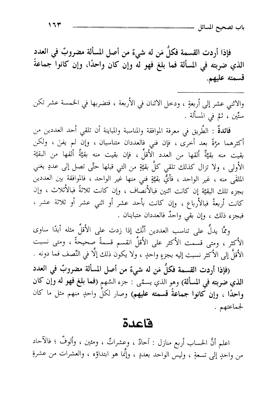 فائدة: الطريق في معرفة الموافقة والمناسبة والمباينة أن تلقي أحد العددين من أكثرهما مرة بعد أخرى فإن فني فالعددان متناسبان وإن لم يفن ولكن بقيت منه بقية ألقها من العدد الأقل فإن بقيت منه بقية ألقها من البقية الأولى: ولا تزال كذلك تلقي كل بقية من التي قبلها حتى تصل إلى عدد يغني الملقى منه غير الواحد فأي بقية فني منها غير الواحد فالموافقة بين العددين بجزء تلك البقية إن كانت اثنين فبالأنصاف وإن كانت ثلاثة فبالأثلاث وإن كانت أربعة فبالأرباع وإن كانت بأحد عشر أو اثني عشر أو ثلاثة عشر فبجزء ذلك وإن بقي واحد فالعددان متباينان.