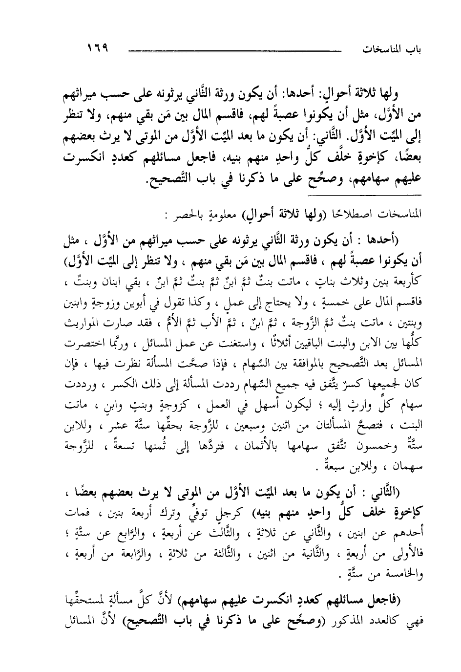 ولها ثلاثة أحوال أحدها أن يكون ورثة الثاني يرثونه على حسب ميراثهم من الأول مثل أن يكونوا عصبة لهم فاقسم المال بين من بقي منهم ولا تنظر إلى الميت الأول الثاني أن يكون ما بعد الميت الأول من الموتى لا يرث بعضهم بعضا كإخوة خلف كل واحد منهم بنيه فاجعل مسائلهم كعدد انكسرت عليهم سهامهم وصحح على ما ذكرنا في باب التصحيح.