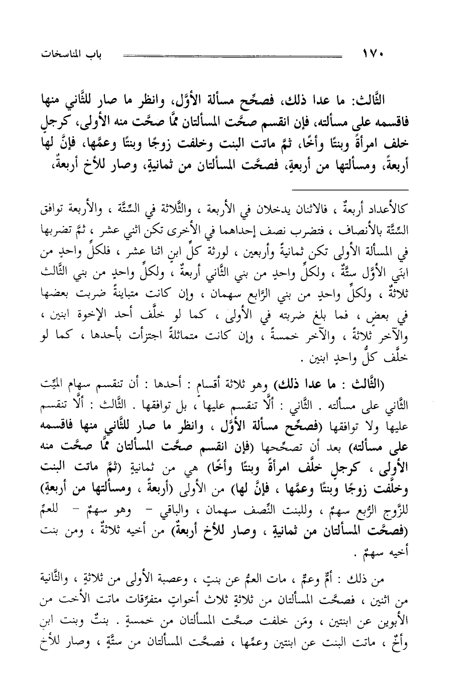 "الثالث: ما عدا ذلك" وهو ثلاثة أقسام أحدها أن ينقسم سهام الميت الثاني على مسألته الثاني أن لا ينقسم عليها بل يوافقها الثالث أن لا ينقسم عليها ولا يوافقها "فصحح مسألة الأول وانظر ما صار للثاني منها فاقسمه على مسألته" بعد أن تصححها " فإن انقسم صحت المسألتان مما صحت منه الأولى كرجل خلف امرأة وبنتا وأخا" هي من ثمانية "ثم ماتت البنت وخلفت زوجا وبنتا وعمها فإن لها" من الأولى "أربعة مسألتها من أربعة" للزوج الربع سهم وللبنت النصف سهمان والباقي وهو سهم للعم "فصحت المسألتان من ثمانية وصار للأخ أربعة" من أخيه ثلاثة ومن بنت أخيه سهم.