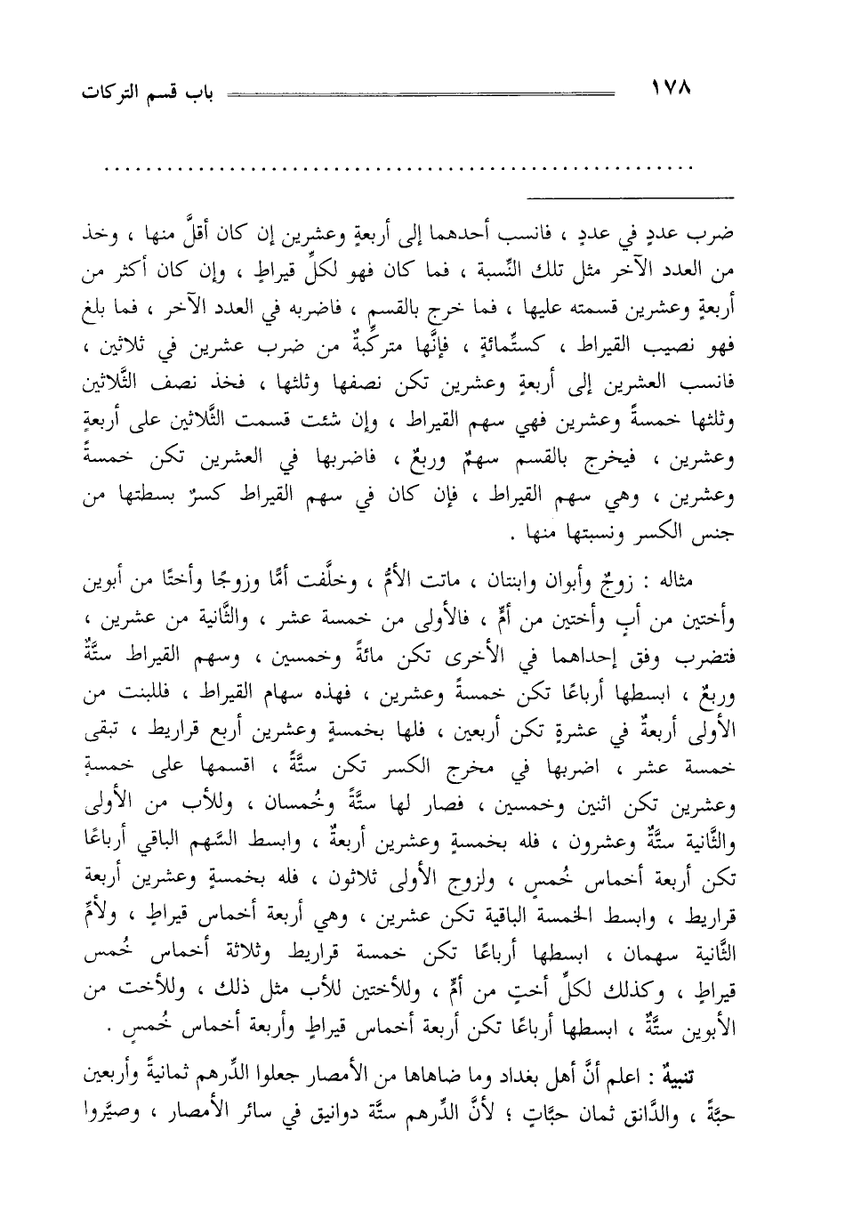 تنبيه: اعلم أن أهل بغداد وما ضاهاها من الأمصار جعلوا الدرهم ثمانية وأربعين حبة والدانق ثمان حبات لأن الدرهم ستة دوانيق في سائر الأمصار وصيروا