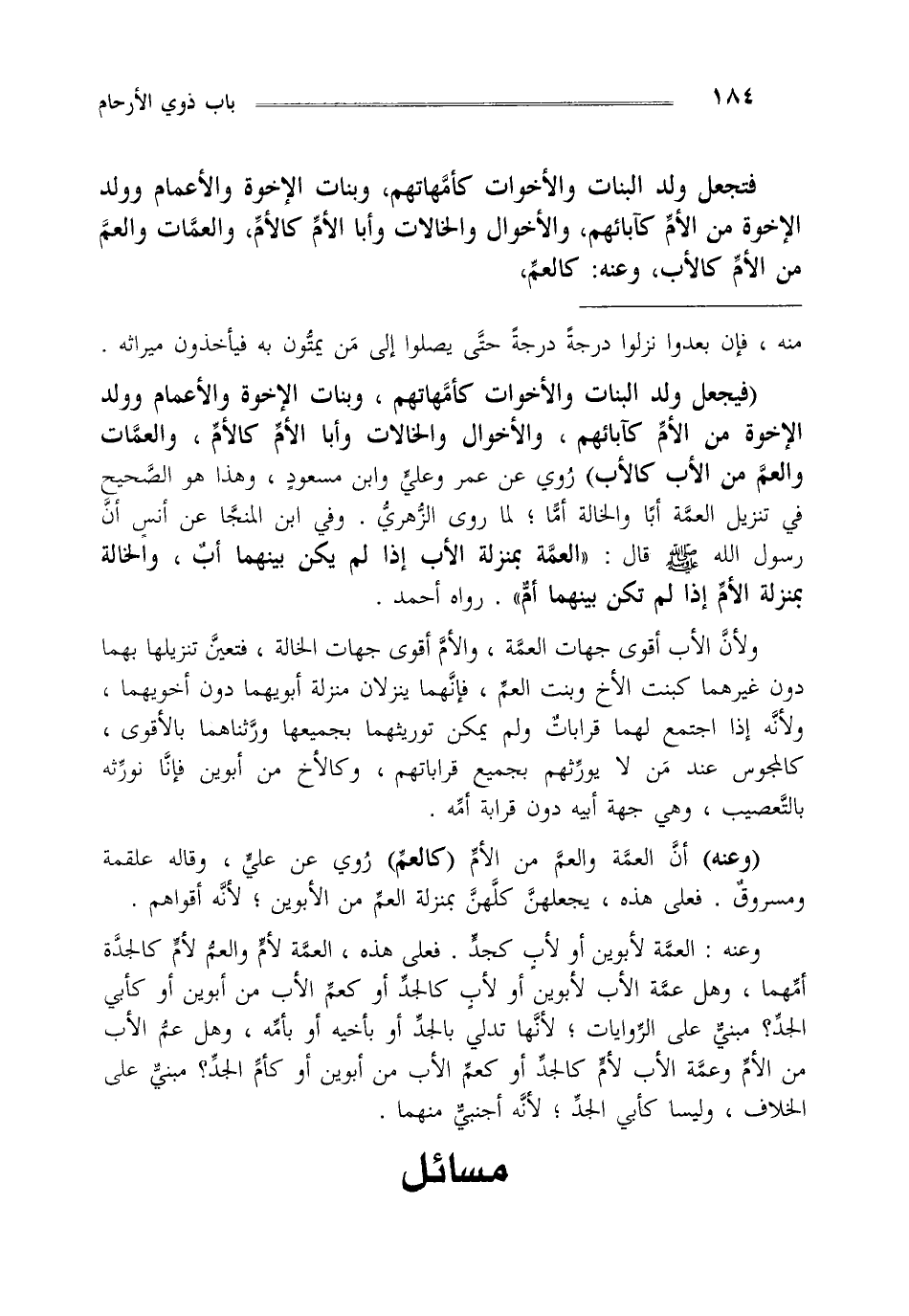 "فيجعل ولد البنات والأخوات كأمهاتهم وبنات الإخوة والأعمام وولد الإخوة من الأم كآبائهم والأخوال والخالات وأبا الأم كالأم والعمات والعم من الأم كالأب" روي عن عمر وعلي وابن مسعود وهذا هو الصحيح في تنزيل العمة أبا والخالة أما لما روى الزهري وفي ابن المنجا عن أنس أن رسول الله صلى الله عليه وسلم قال: "العمة بمنزلة الأب إذا لم يكن بينهما أب والخالة بمنزلة الأم إذا لم يكن بينهما أم" رواه أحمد.