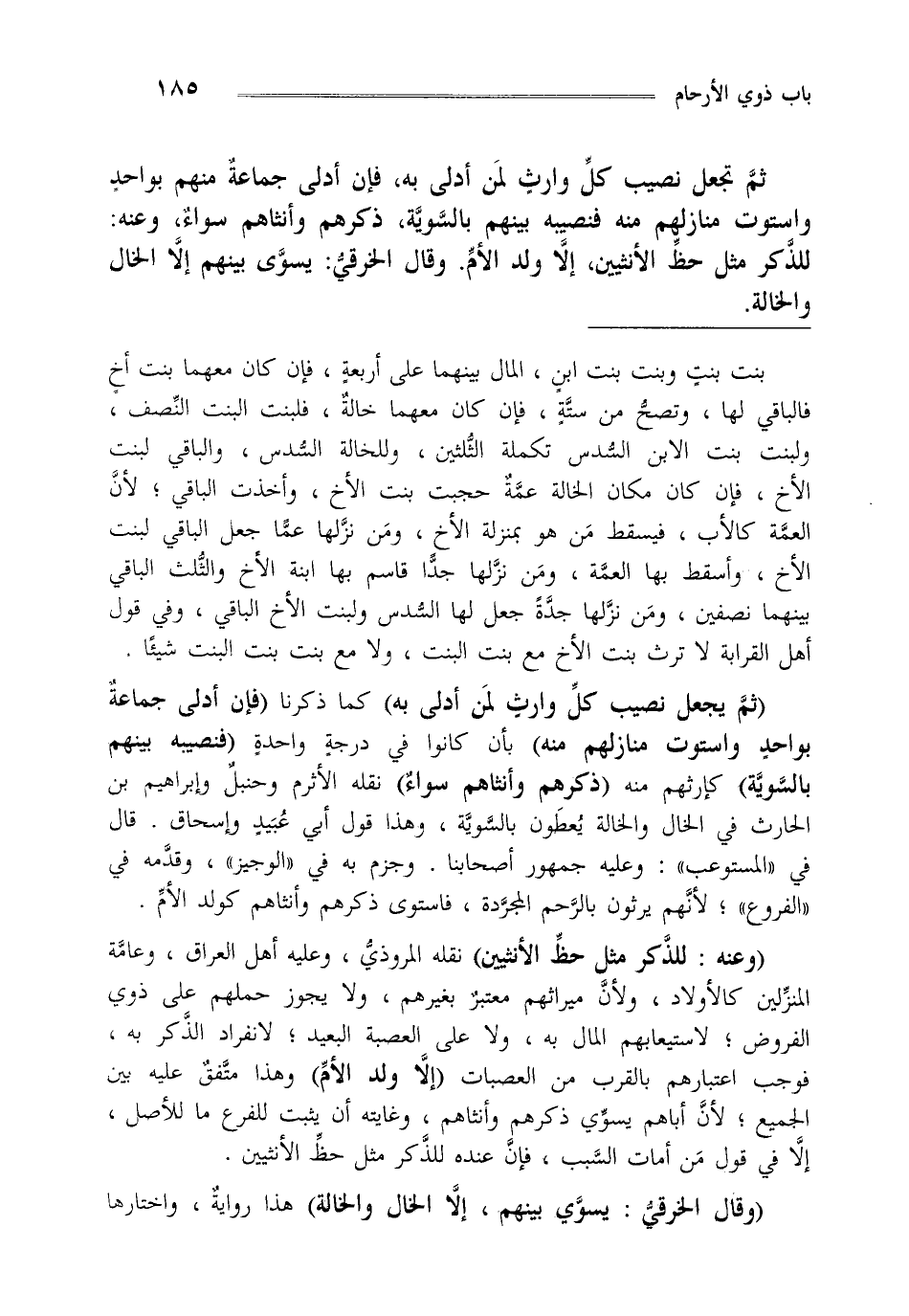 ثم تجعل نصيب كل وارث لمن أدلى به فإن أدلى جماعة منهم بواحد واستوت منازلهم منه فنصيبه بينهم بالسوية ذكرهم وأنثاهم سواء وعنه: للذكر مثل حظ الآنثيين إلا ولد الأم وقال الخرقي يسوى بينهم إلاالخال والخالة.
