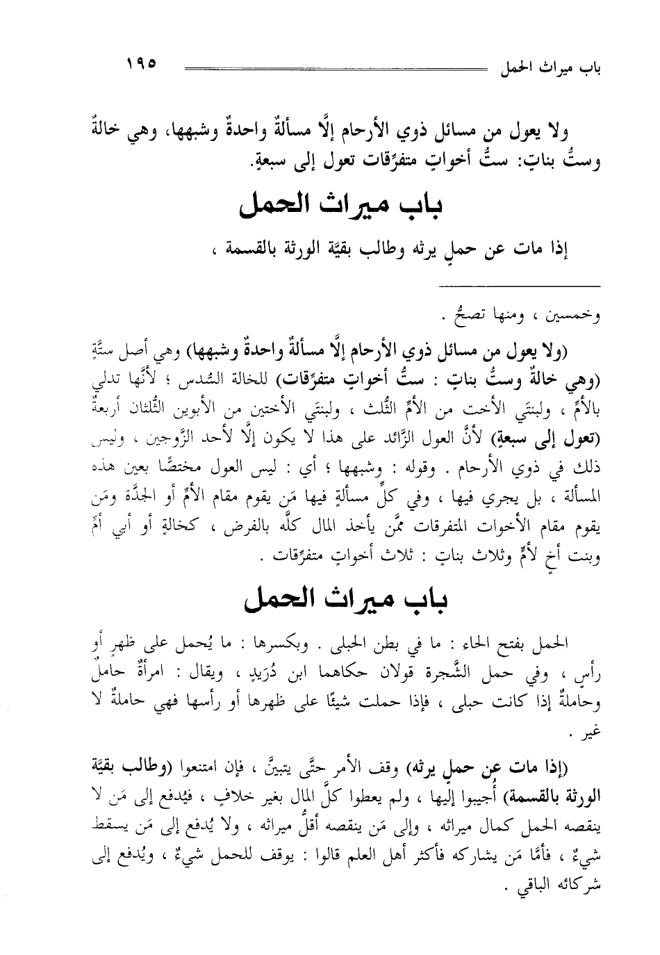 "ولا يعول من مسائل ذوي الأرحام إلا مسألة واحدة وشبهها" وهي أصل ستة "وهي خالة وست بنات ست أخوات متفرقات" للخالة السدس لأنها تدلي بالأم ولبنتي الأخت من الأم الثلث ولبنتي الأختين من الأبوين الثلثان أربعة "تعول إلى سبعة" لأن العول الزائد على هذا لا يكون إلا لأحد الزوجين وليس ذلك في ذوي الأرحام وقوله وشبهها أي: ليس العول مختصا بعين هذه المسألة بل يجري فيها وفي كل مسألة فيها من يقوم مقام الأم أو الجدة ومن يقوم مقام الأخوات المفترقات ممن يأخذالمال كله بالفرض كخالة أو أبي أم وبنت أخ لأم وثلاث بنات ثلاث أخوات متفرقات.