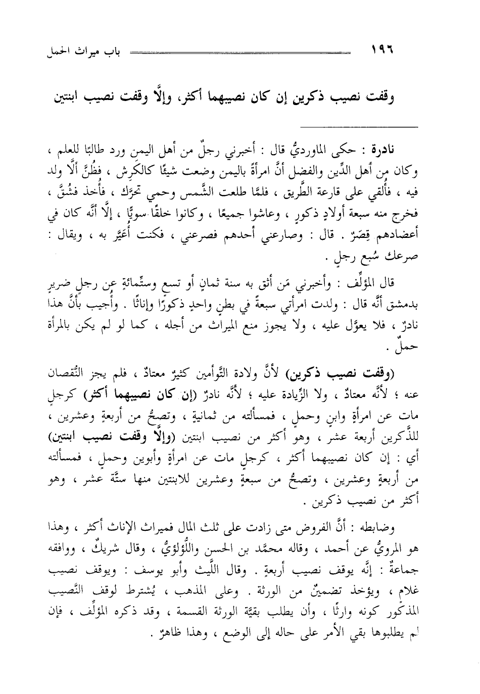 وضابطه: أن الفروض متى زادت على ثلث المال فميراث الإناث أكثر وهذا هو المروي عن أحمد وقاله محمد ابن الحسن واللؤلؤي وقال شريك ووافقه جماعة إنه يوقف نصيب أربعة وقال الليث وأبو يوسف ويوقف نصيب غلام ويؤخذ ضمين من الورثة وعلى المذهب يشترط لوقف النصيب المذكور كونه وارثا وأن يطلب بقية الورثة القسمة وقد ذكره المؤلف فإن لم يطلبوها بقي الأمر على حاله إلى الوضع وهذا ظاهر.