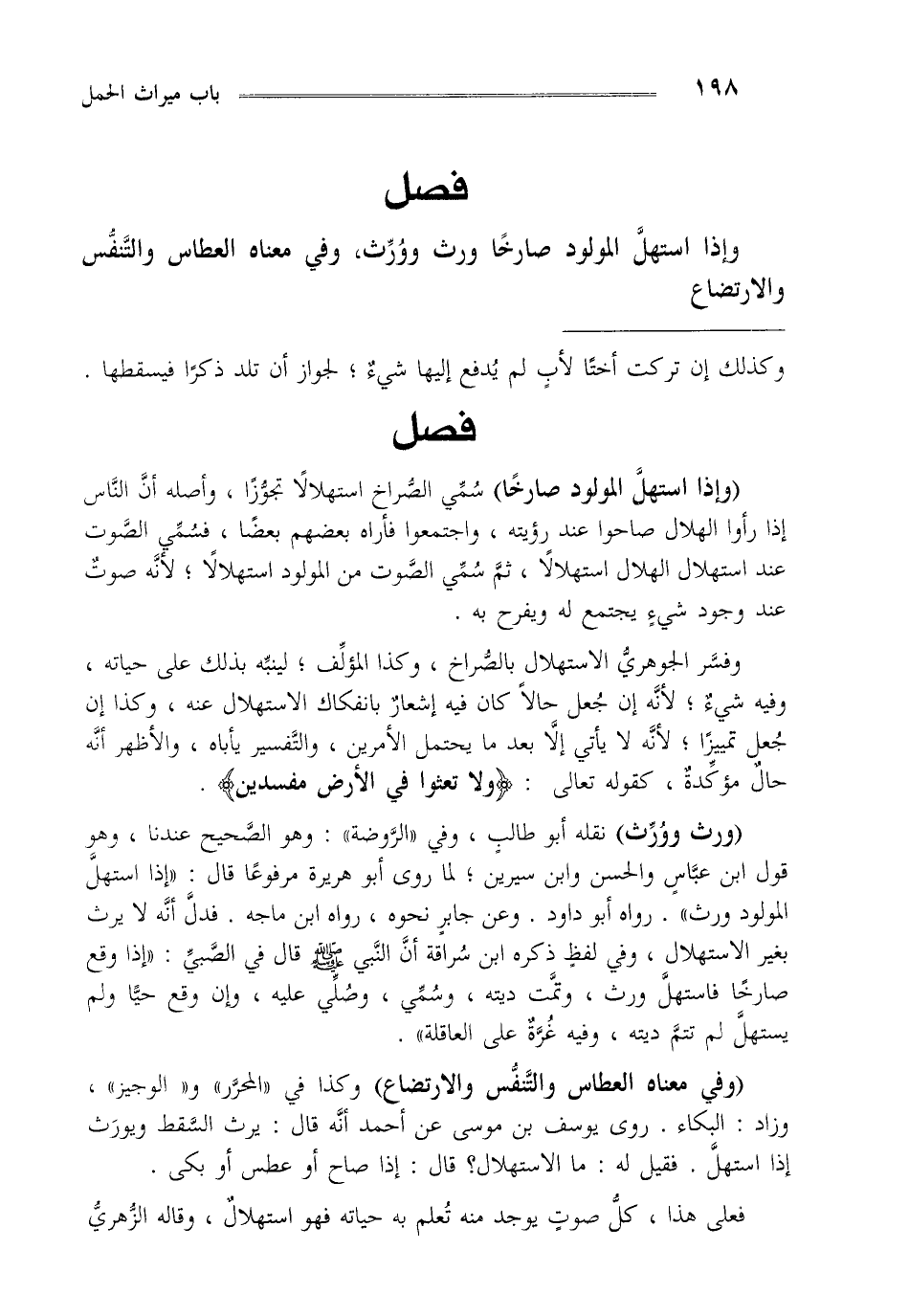 وإذا استهل المولود صارخا ورث وورث وفي معناه العطاس والتنفس والارتضاع