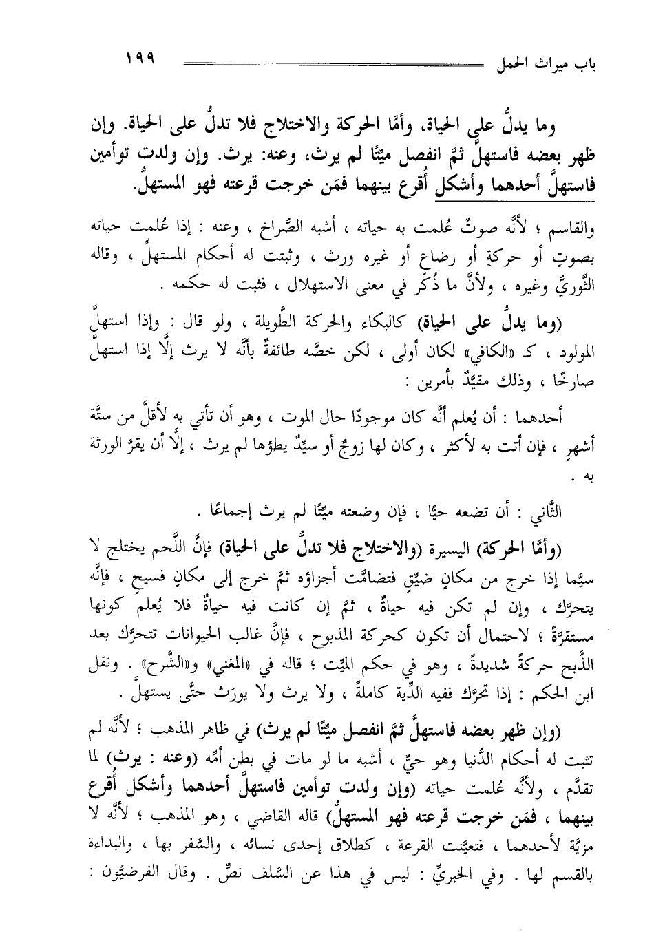 وما يدل على الحياة وأما الحركة والاختلاج فلا تدل على الحياة وإن ظهر بعضه فاستهل ثم انفصل ميتا لم يرث وعنه: يرث وإن ولدت توأمين فاستهل أحدهما وأشكل أقرع بينهما فمن خرجت قرعته فهو المستهل.