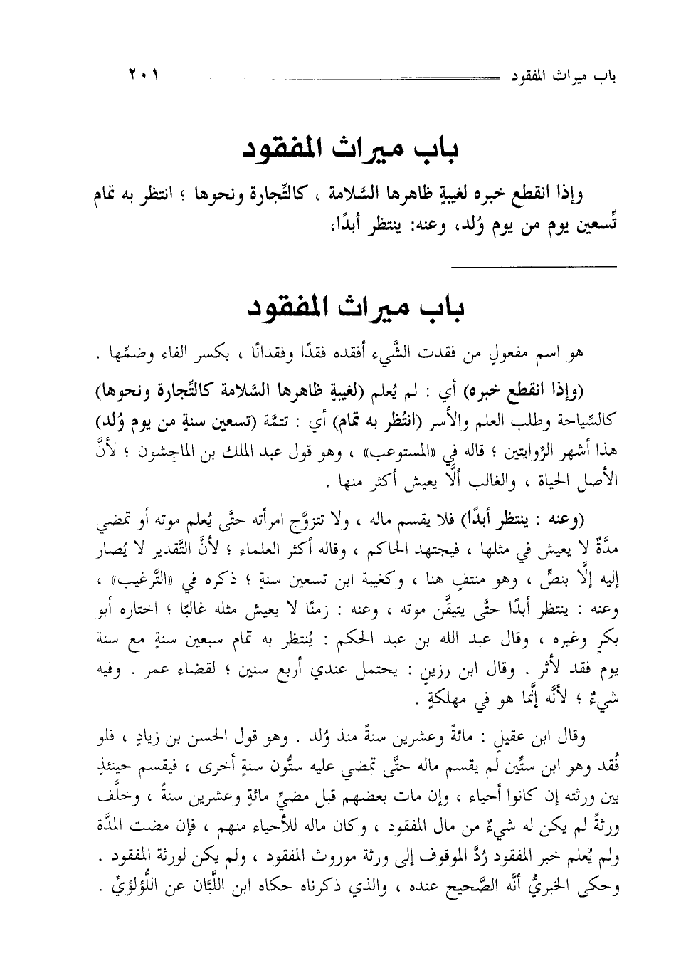 "وإذا انقطع خبره" أي: لم يعلم "لغيبة ظاهرها السلامة كالتجارة ونحوها" كالسياحة وطلب العلم والأسر "انتظر به تمام" أي: تتمة "تسعين سنة من يوم ولد" هذا أشهر الروايتين قاله في المستوعب وهو قول عبدالملك بن الماجشون لأن الأصل الحياة والغالب أن لا يعيش أكثر منها.