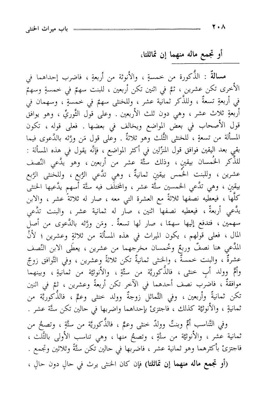 مسألة: الذكورة من خمسة والأنوثة من أربعة فاضرب إحداهما في الأخرى تكن عشرين ثم في اثنين تكن أربعين للبنت سهم في خمسة وسهم في أربعة تسعة وللذكر ثمانية عشر وللخنثى سهم في خمسة وسهمان في أربعة ثلاث عشر وهي دون ثلث الأربعين وعلى قول الثوري وهو يوافق قول الأصحاب في بعض المواضع ويخالف في بعضها فعلى قوله تكون المسألة من تسعة للخنثى الثلث وهو ثلاثة وعلى قول من ورثه بالدعوى فيما بقي بعد اليقين فوافق قول المنزلين في أكثر المواضع فإنه يقول في هذه المسألة للذكر الخمسان بيقين وذلك ستة عشر من أربعين وهو يدعي النصف عشرين وللبنت الخمس بيقين ثمانية وهي تدعي الربع وللخنثى الربع بيقين وهي يدعي الخمسين ستة عشر والمختلف فيه ستة أسهم يدعيها الخنثى كلها فيعطيه نصفها ثلاثة مع العشرة التي معه صار له ثلاثة عشر والابن يدعي أربعة فيعطيه نصفها اثنين صار له ثمانية عشر والبنت تدعي سهمين فتدفع إليها سهما صار لها تسعة ومن ورثه بالدعوى من أصل المال فعلى قولهم يكون الميراث في هذه المسألة من ثلاثة وعشرين لأن المدعي هنا نصف وربع وخمسان مخرجهما من عشرين يعطى الابن النصف عشرة والبنت خمسة والخنثى ثمانية تكن ثلاثة وعشرين وفي التوافق زوج وأم وولد أب خنثى فالذكورية من ستة والأنوثية من ثمانية وبينهما موافقة فاضرب نصف أحدهما في الآخر تكن أربعة وعشرين ثم في اثنين تكن ثمانية وأربعين وفي التماثل زوجة وولد خنثى وعم فالذكورية من ثمانية والأنوثية كذلك فاجتزئ بإحداهما واضربها في حالين تكن ستة عشر.