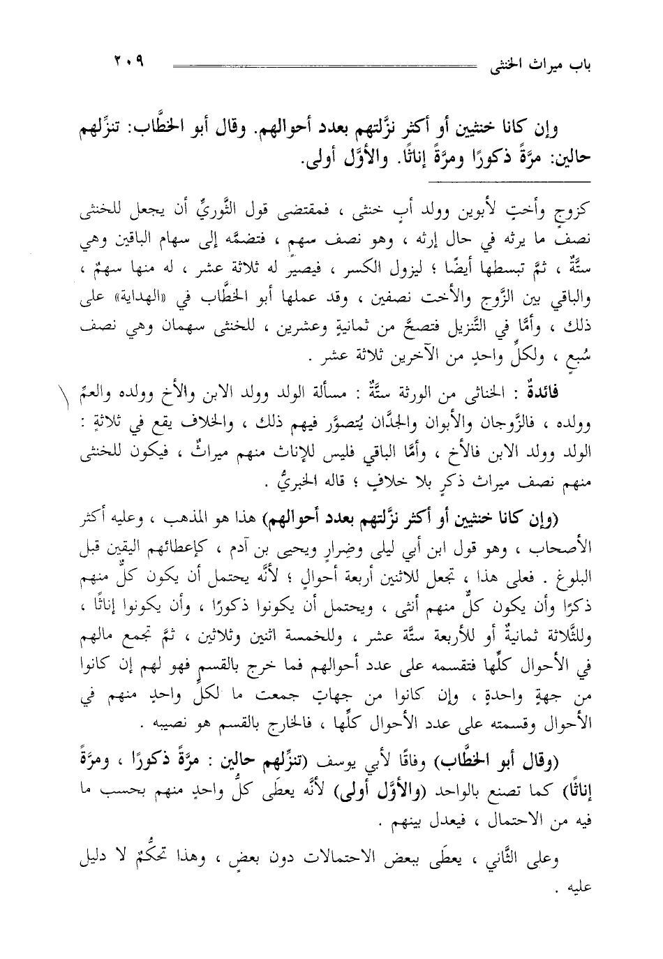 "وقال ابو الخطاب" وفاقا لأبي يوسف "تنزلهم حالين مرة ذكورا ومرة إناثا" كما تصنع بالواحد "والأول أولى" لأنه يعطى كل واحد منهم بحسب ما فيه من الاحتمال فيعدل بينهم.