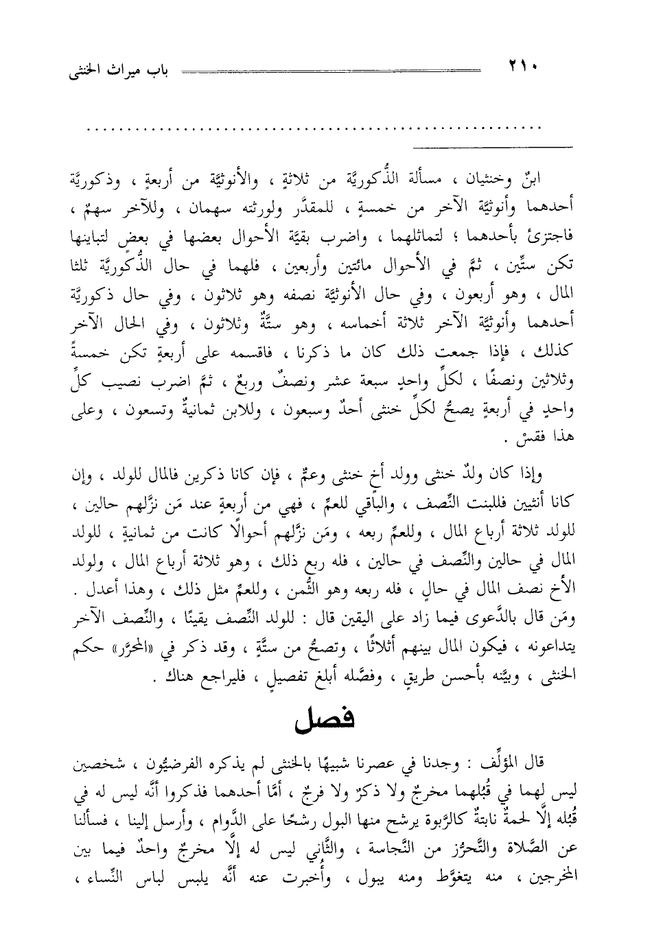 قال المؤلف: وجدنا في عصرنا شبيها بالخنثى لم يذكره الفرضيون شخصين ليس لهما في قبلهما مخرج ولا ذكر ولا فرج أما أحدهما فذكروا أنه ليس له في قبله إلا لحمة نابتة كالربوة يرشح منها البول رشحا على الدوام وأرسل إلينا فسألنا عن الصلاة والتحرز من النجاسة والثاني ليس له إلا مخرج واحد فيما بين المخرجين منه يتغوط ومنه يبول وأخبرت عنه أنه يلبس لباس النساء،