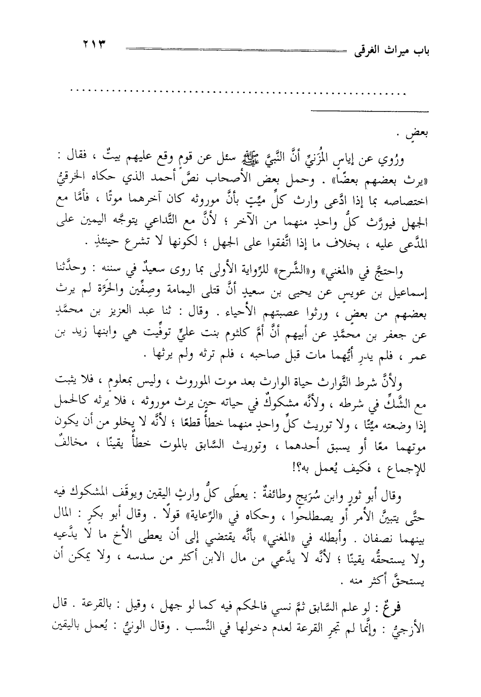واحتج في المغني والشرح للرواية الأولى: بما روى سعيد في سننه وحدثنا إسماعيل بن عويس عن يحيى بن سعيد أن قتلى اليمامة وصفين والحرة لم يرث بعضهم من بعض ورثوا عصبتهم الأحياء وقال ثنا عبدالعزيز بن محمد عن جعفر بن محمد عن أبيهم أن أم كلثوم بنت علي توفيت هي وابنها زيد بن عمر فلم يدر أيهما مات قبل صاحبه فلم ترثه ولم يرثها.