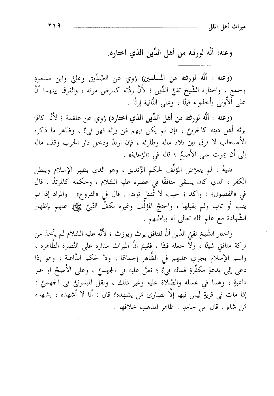 واختار الشيخ تقي الدين أن المنافق يرث ويورث لأنه عليه السلام لم يأخذ من تركة منافق شيئا ولا جعله فيئا فعلم أن الميراث مداره على النصرة الظاهرة واسم الإسلام يجري عليهم في الظاهر إجماعا ولا لحكم الداعية وهو إذا دعي إلى بدعة مكفرة فماله فيء نص عليه في الجهمي وعلى الأصح أو غيرداعية وهما في غسله والصلاة عليه وغير ذلك ونقل الميموني في الجهمي إذا مات في قرية ليس فيها إلا نصارى من يشهده قال أنا لا أشهده يشهده من شاء قال ابن حامد ظاهر المذهب خلافها.