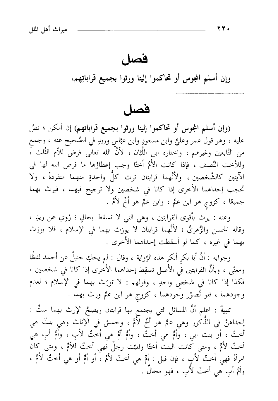 "وإن أسلم المجوس أو تحاكموا إلينا ورثوا بجميع قراباتهم" إن أمكن نص عليه وهو قول عمر وعلي وابن مسعود وابن عباس وزيد في الصحيح عنه وجمع من التابعين وغيرهم واختاره ابن اللبان لأن الله تعالى فرض للأم الثلث وللأخت النصف فإذا كانت الأم أختا وجب إعطاؤها ما فرض الله لها في الآيتين كالشخصين ولأنهما قرابتان ترث كل واحد منهما منفردة ولا تحجب إحداهما الأخرى إذا كانا في شخصين ولا ترجيح فيهما فيرث بهما جميعا كزوج هو ابن عم وابن عم هو أخ لأم.