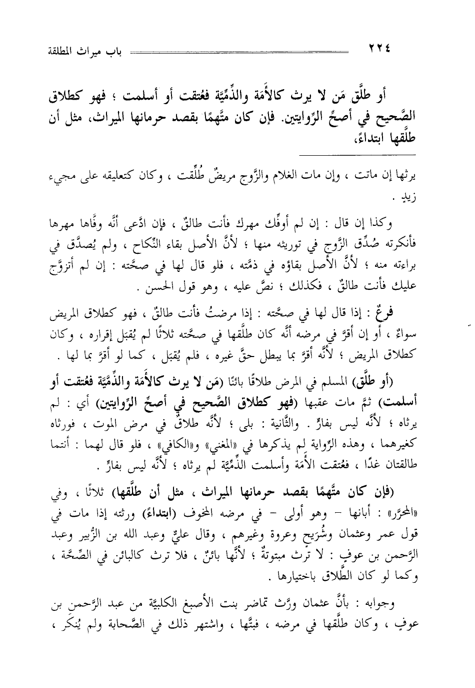 "أو طلق" المسلم في المرض طلاقا بائنا "من لا يرث كالأمة والذمية فعتقت أو أسلمت" ثم مات عقبها "فهو كطلاق الصحيح في أصح الروايتين" أي: لم يرثاه لأنه ليس بفار و الثانية: بلى لأنه طلاق في مرض الموت فورثاه كغيرهما وهذه الرواية لم يذكرها في المغني والكافي فلو قال لهما أنتما طالقتان غدا فعتقت الأمة وأسلمت الذمية لم يرثاه لأنه ليس بفار.