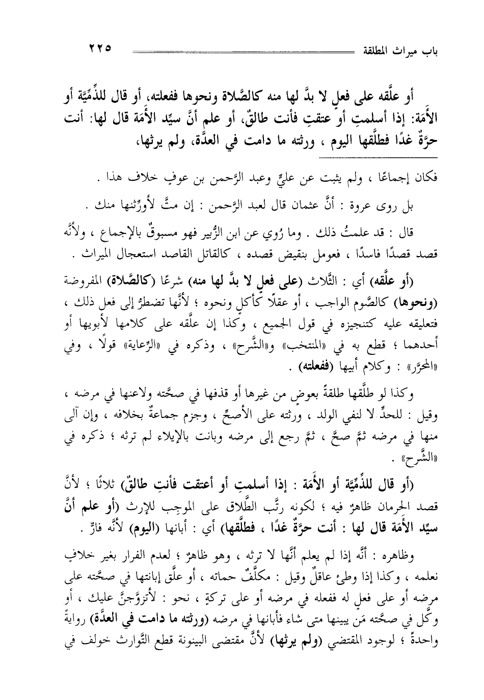 "أو قال للذمية أو الأمة إذا أسلمت أو عتقت فأنت طالق" ثلاثا لأن قصد الحرمان ظاهر فيه لكونه رتب الطلاق على الموجب للإرث "أو علم أن سيد الأمة قال لها أنت حرة غدا فطلقها" أي: أبانها "اليوم" لأنه فار.