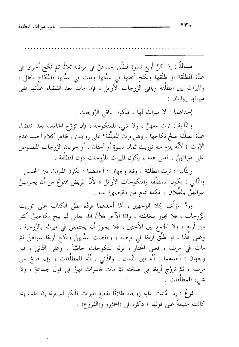 والثانية: ترث معهن ولا شيء للمنكوحة فإن تزج الخامسة: بعد انقضاء عدة المطلقة صح نكاحها وهل ترث المطلقة على روايتين ظاهر كلام أحمد عدم الإرث لأنه يلزم منه توريث ثمان نسوة أو أختان أو حرمان الزوجات المنصوص على ميراثهن فعلى هذا يكون الميراث للزوجات دون المطلقة.