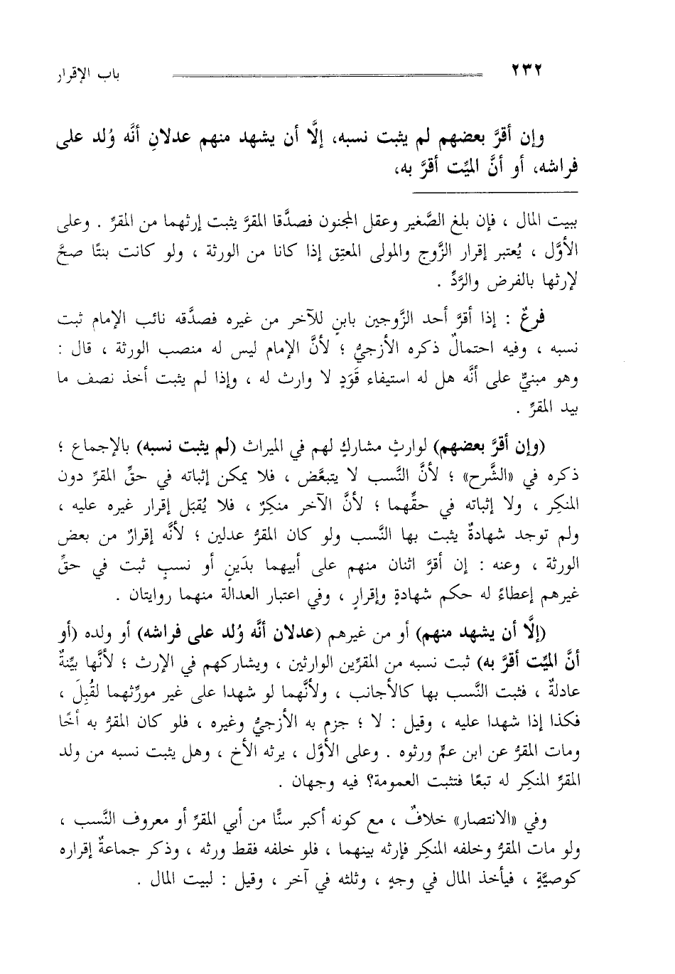 "إلا أن يشهد منهم" أو من غيرهم "عدلان أنه ولد على فراشه" أو ولده "أو أن الميت أقر به" ثبت نسبه من المقرين الوارثين ويشاركهم في الإرث لأنها بينة عادلة فثبت النسب بها كالأجانب ولأنهما لو شهدا على غير مورثهما لقبل فكذا إذا شهدا عليه وقيل: لا جزم به الأزجي وغيره فلو كان المقر به أخا ومات المقر عن ابن عم ورثوه وعلى الأول يرثه الأخ وهل يثبت نسبه من ولد المقر المنكر له تبعا فتثبت العمومة فيه وجهان.