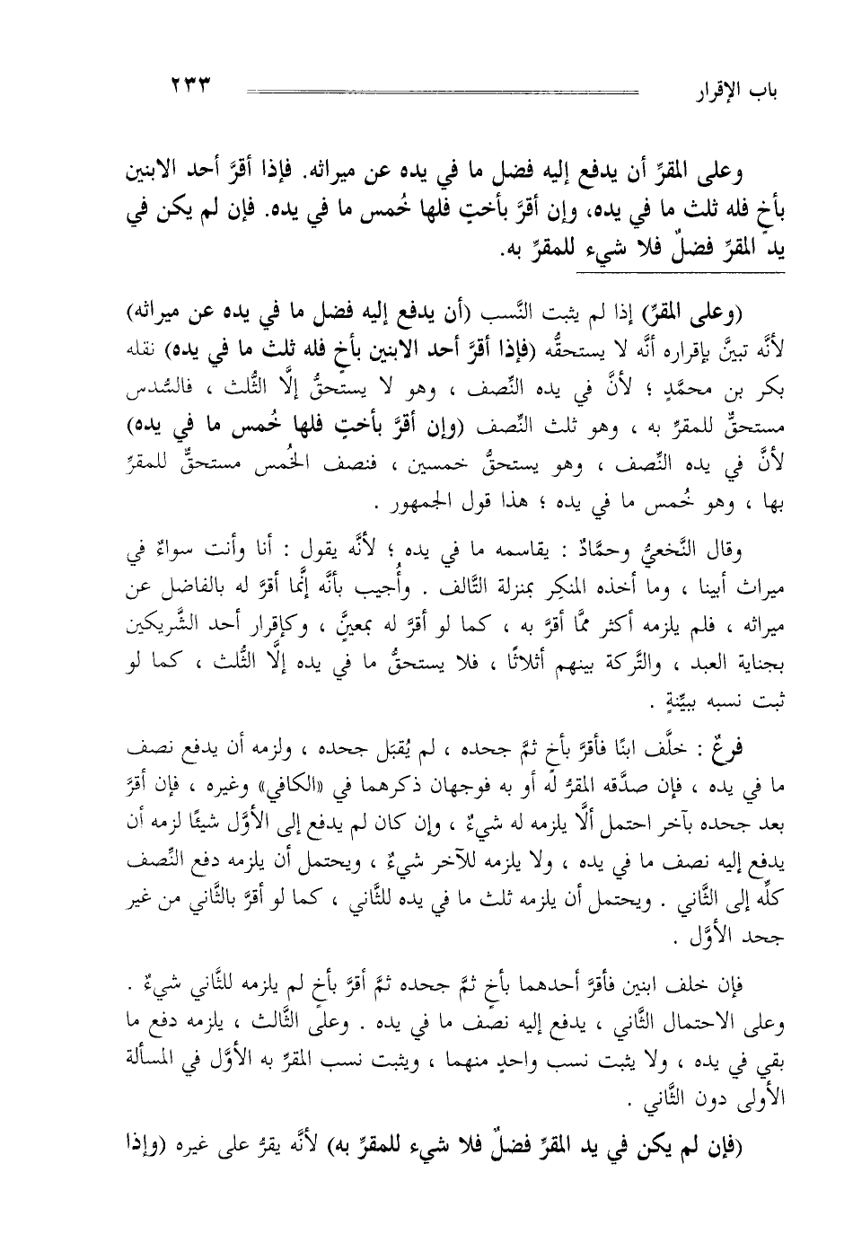 "وعلى المقر" إذا لم يثبت النسب "أن يدفع إليه فضل ما في يده عن ميراثه" لأنه تبين بإقراره أنه لا يستحقه "فإذا أقر أحد الابنين بأخ فله ثلث ما في يده" نقله بكر بن محمد لأن في يده النصف وهو لا يستحق إلا الثلث فالسدس مستحق للمقر به وهو ثلث النصف "وإن أقر بأخت فلها خمس ما في يده" لأن في يده النصف وهو يستحق خمسين فنصف الخمس مستحق للمقر بها وهو خمس ما في يده هذا قول الجمهور.