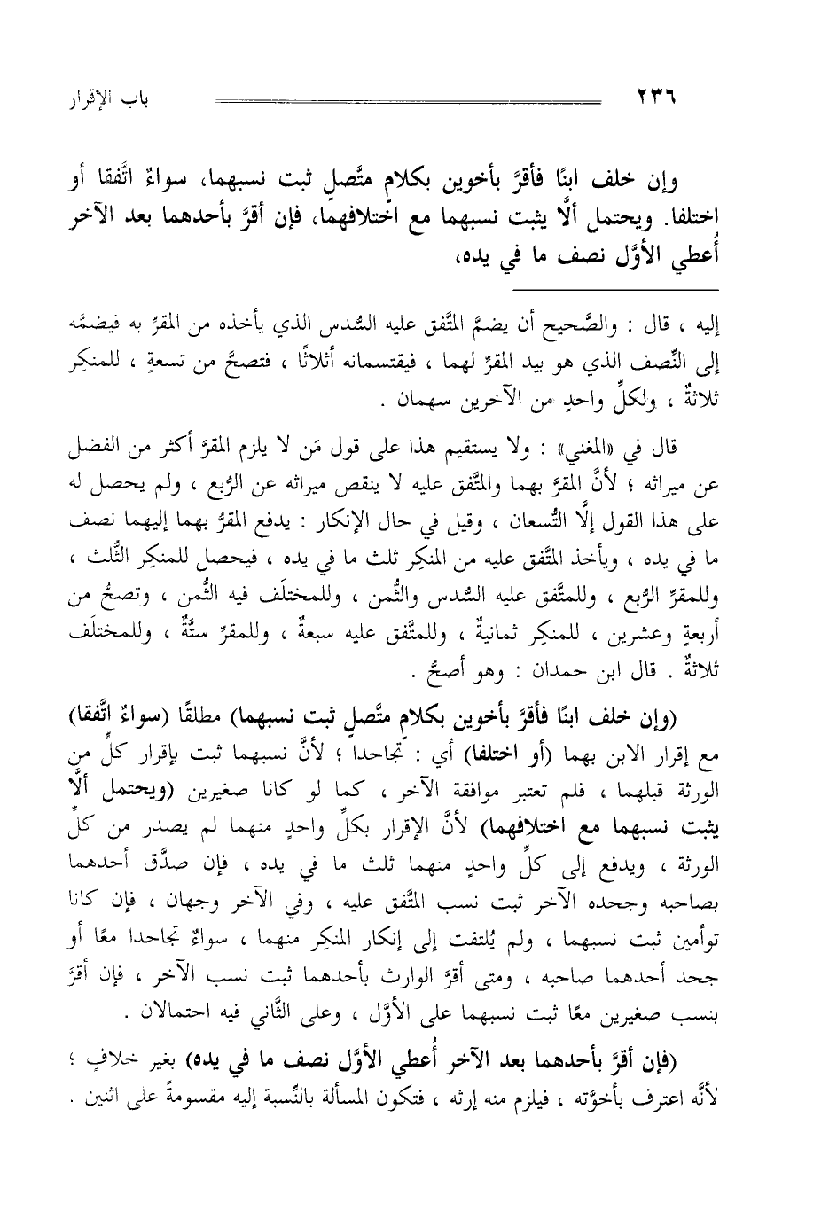 "وإن خلف ابنا فأقر بأخوين بكلام متصل ثبت نسبهما" مطلقا "سواء اتفقا" مع إقرار الإبن بهما "أو اختلقا" أي: تجاحدا لأن نسبهما ثبت بإقرار كل من الورثة قبلهما فلم تعتبر موافقة الآخر كما لو كانا صغيرين "ويحتمل ألا يثبت نسبهما مع اختلافهما" لأن الإقرار بكل واحد منهما لم يصدر من كل الورثة ويدفع إلى كل واحد منهما ثلث ما في يده فإن صدق أحدهما بصاحبه وجحده الآخر ثبت نسب المتفق عليه وفي الآخر وجهان فإن كانا توأمين ثبت نسبهما ولم يلتفت إلى إنكار المنكر منهما سواء تجاحدا معا أو جحد أحدهما صاحبه ومتى أقر الوارث بأحدهما ثبت نسب الآخر فإن أقر بنسب صغيرين معا ثبت نسبهما على الأول وعلى الثاني فيه احتمالان.