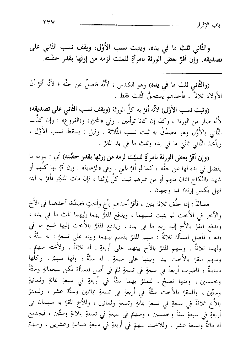 مسألة: إذا خلف ثلاثة بنين فأقر أحدهم بأخ وأخت فصدقه أحدهما في الأخ والآخر في الأخت لم يثبت نسبهما ويدفع المقر بهما إليهما ثلث ما في يده ويدفع المقر بالأخ إليه ربع ما في يده ويدفع المقر بالأخت إليها سبع ما في يده فأصل المسألة ثلاثة سهم المقر يقسم بينهما وبينه على تسعة له ستة ولهما ثلاثة وسهم المقر بالأخ بينهما على أربعة له ثلاثة ولأخته سهم وسهم المقر بالأخت بينه وبينها على سبعة له ستة ولها سهم وكلها متباينة فاضرب أربعة في سبعة في تسعة ثم في أصل المسألة تكن سبعمائة وستة وخمسين ومنها تصح للمقر بهما ستة في أربعة في سبعة بمائة وثمانين وستين وللمقر بالأخت ستة في أربعة في تسعة بمائتين وستة عشر وللمقر بالأخ ثلاثة في سبعة في تسعة بمائة وتسعة وثمانين وللأخ المقر به سهمان في أربعة في سبعة ستة وخمسين وسهم في سبعة في تسعة بثلاثة وستين فيجتمع له مائة وتسعة عشر وللأخت سهم في أربعة في سبعة بثمانية وعشرين وسهم