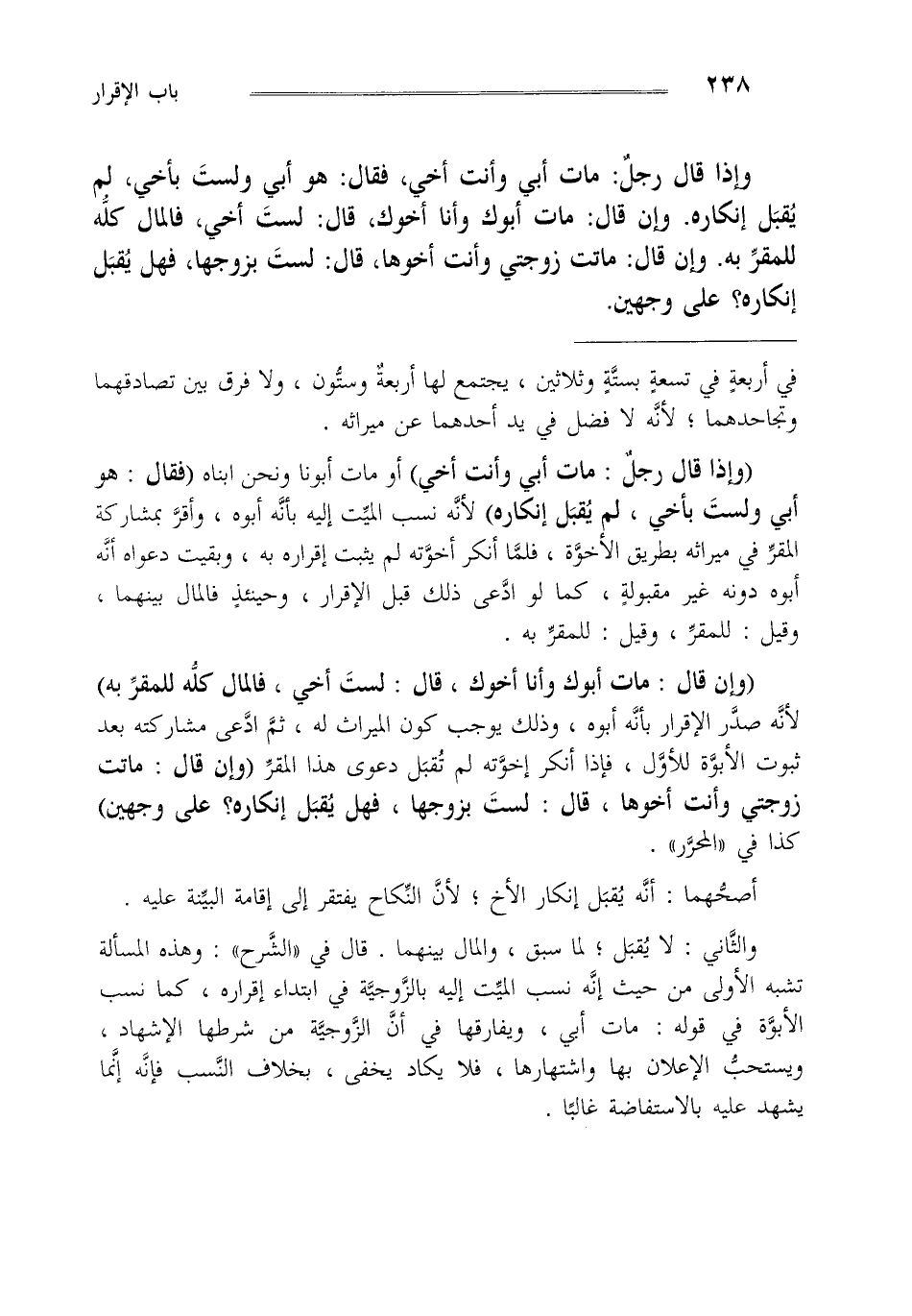 وإذا قال رجل مات أبي وأنت أخي فقال هو أبي ولست بأخي لم يقبل إنكاره وإن قال مات أبوك وأنا أخوك لست أخي فالمال كله للمقربه وإن قال ماتت زوجتي وأنت أخوها قال لست بزوجها فهل يقبل إنكاره على وجهين.