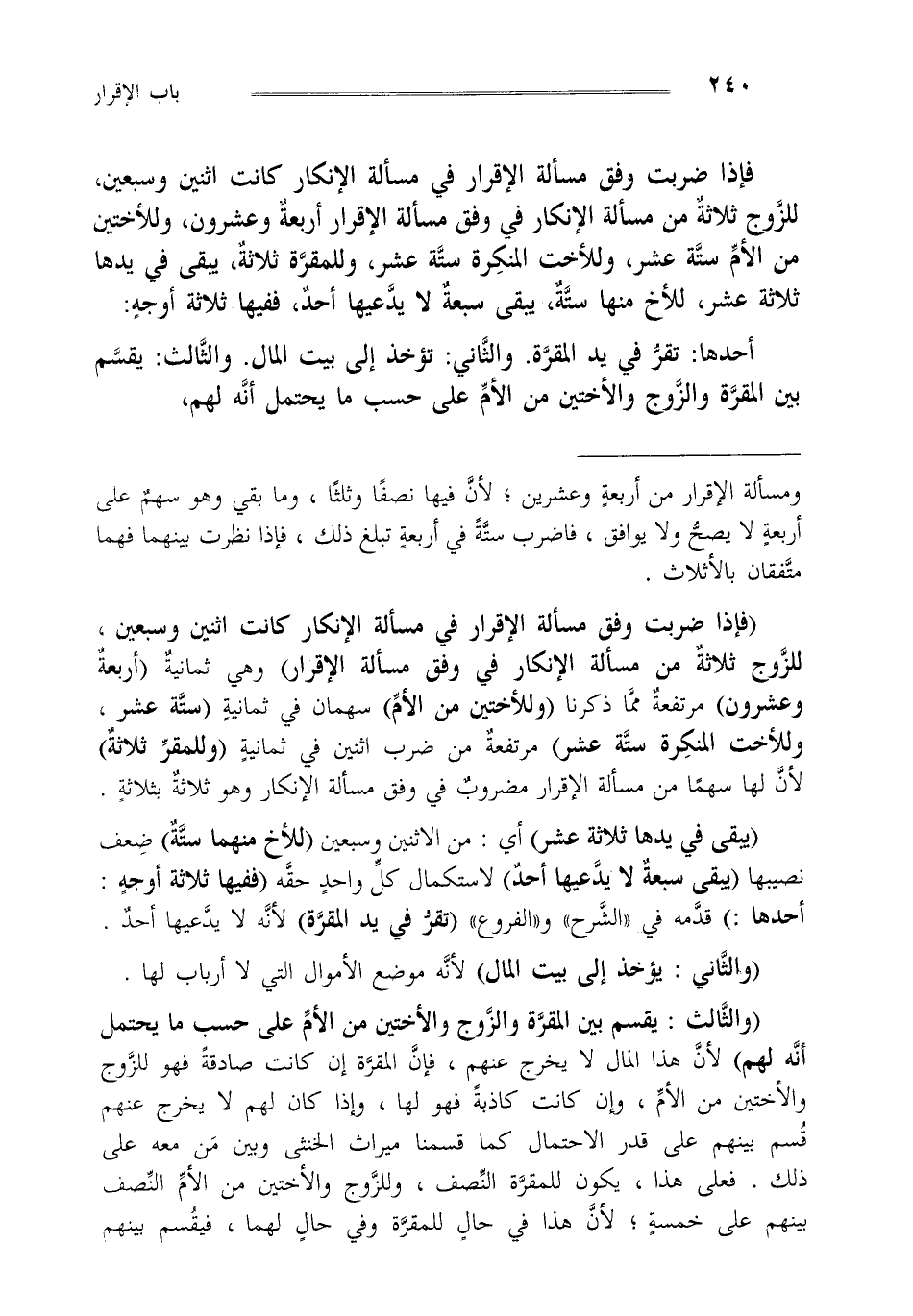 "فإذا ضربت وفق مسألة الإقرار في مسألة الإنكار كانت اثنين وسبعين للزوج ثلاثة من مسألة الإنكار في وفق مسألة الإقرار" وهي ثمانية "أربعة وعشرون" مرتفعة مما ذكرنا "وللأختين من الأم" سهمان في ثمانية "ستة عشر وللأخت المنكرة ستة عشر" مرتفعة من ضرب اثنين في ثمانية "وللمقر ثلاثة" لأن لها سهما من مسألة الإقرار مضروب في وفق مسألة: الإنكار وهو ثلاثة بثلاثة.
