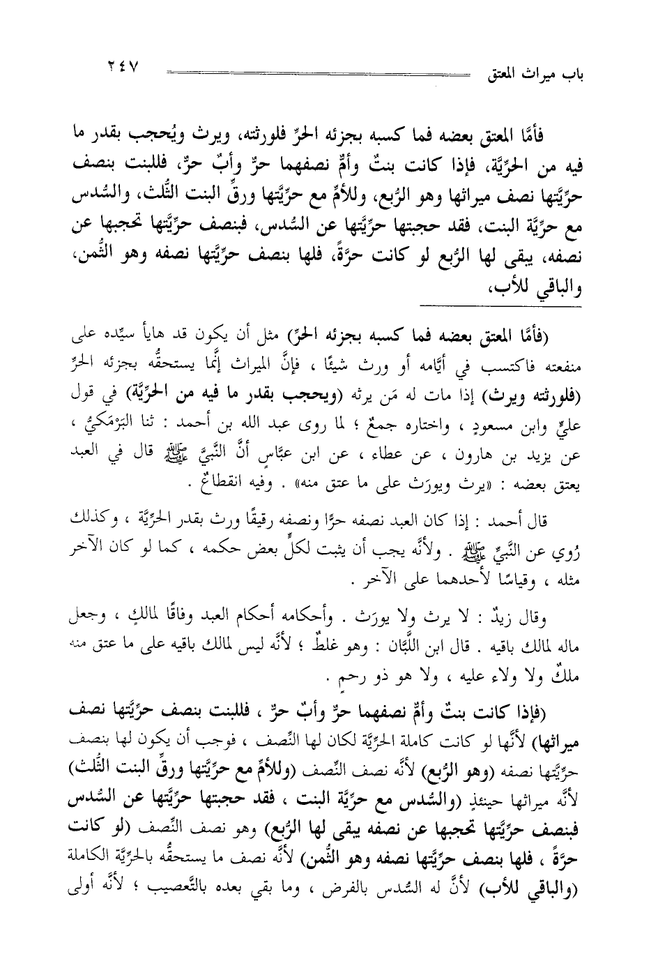 "فإذا كانت بنت وأم نصفهما حر وأب حر فللبنت بنصف حريتها نصف ميراثها" لأنها لو كانت كاملة الحرية لكان لها النصف فوجب أن يكون لها بنصف حريتها نصفه "وهو الربع" لأنه نصف النصف "وللأم مع حريتها ورق البنت الثلث" لأنه ميراثها حينئذ "والسدس مع حرية البنت فقد حجبتها حريتها عن السدس فبنصف حريتها تحجبها عن نصفه يبقى لها الربع" وهو نصف النصف "لو كانت حرة فلها بنصف حريتها نصفه وهو الثمن" لأنه نصف ما يستحقه بالحرية الكاملة "والباقي للأب" لأن له السدس بالفرض وما بقي بعده بالتعصيب لأنه أولى