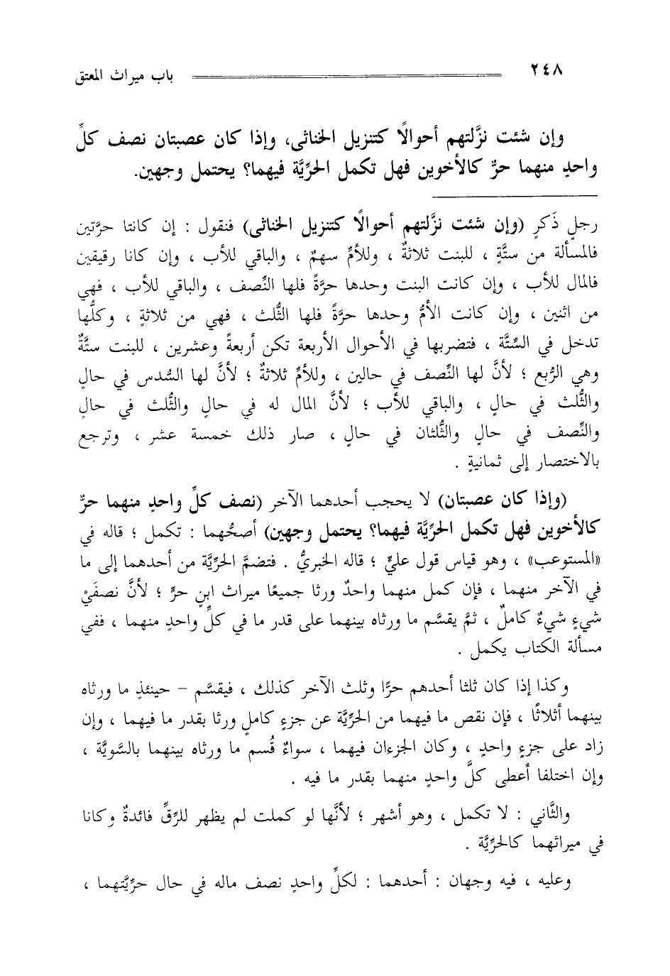 وإن شئت نزلتهم أحوالا كتنزيل الخناثى وإذا كان عصبتان نصف كل واحد منهما حر كالأخوين فهل تكمل الحرية فيهما يحتمل وجهين.