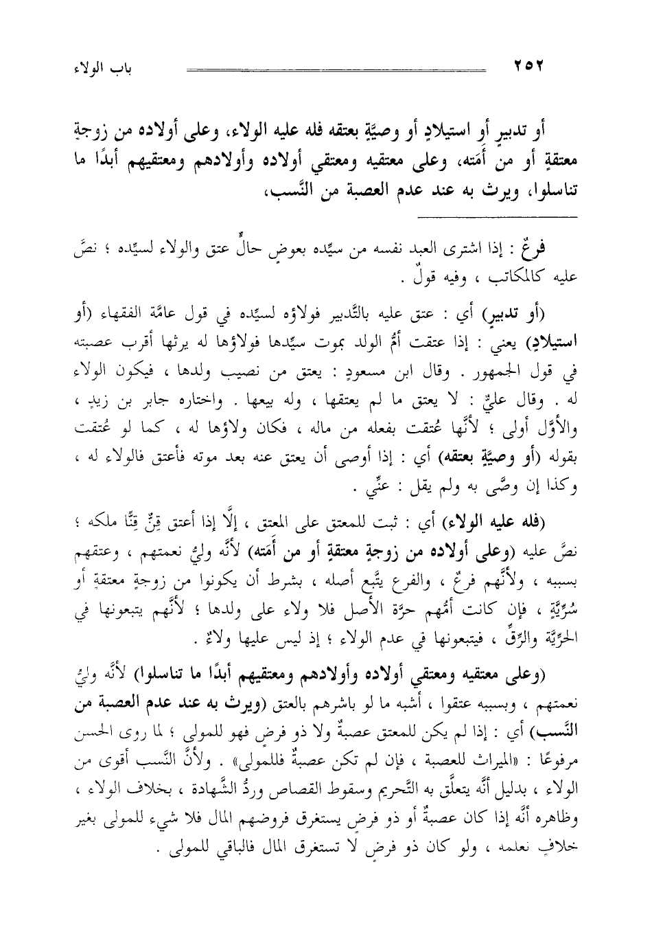 أو تدبير أو استيلاد أو وصية بعتقه فله عليه الولاء وعلى أولاده من زوجة معتقة أو من أمته وعلى معتقيه ومعتقي أولاده وأولادهم ومعتقيهم أبدا ما تناسلوا ويرث به عند عدم العصبة من النسب،