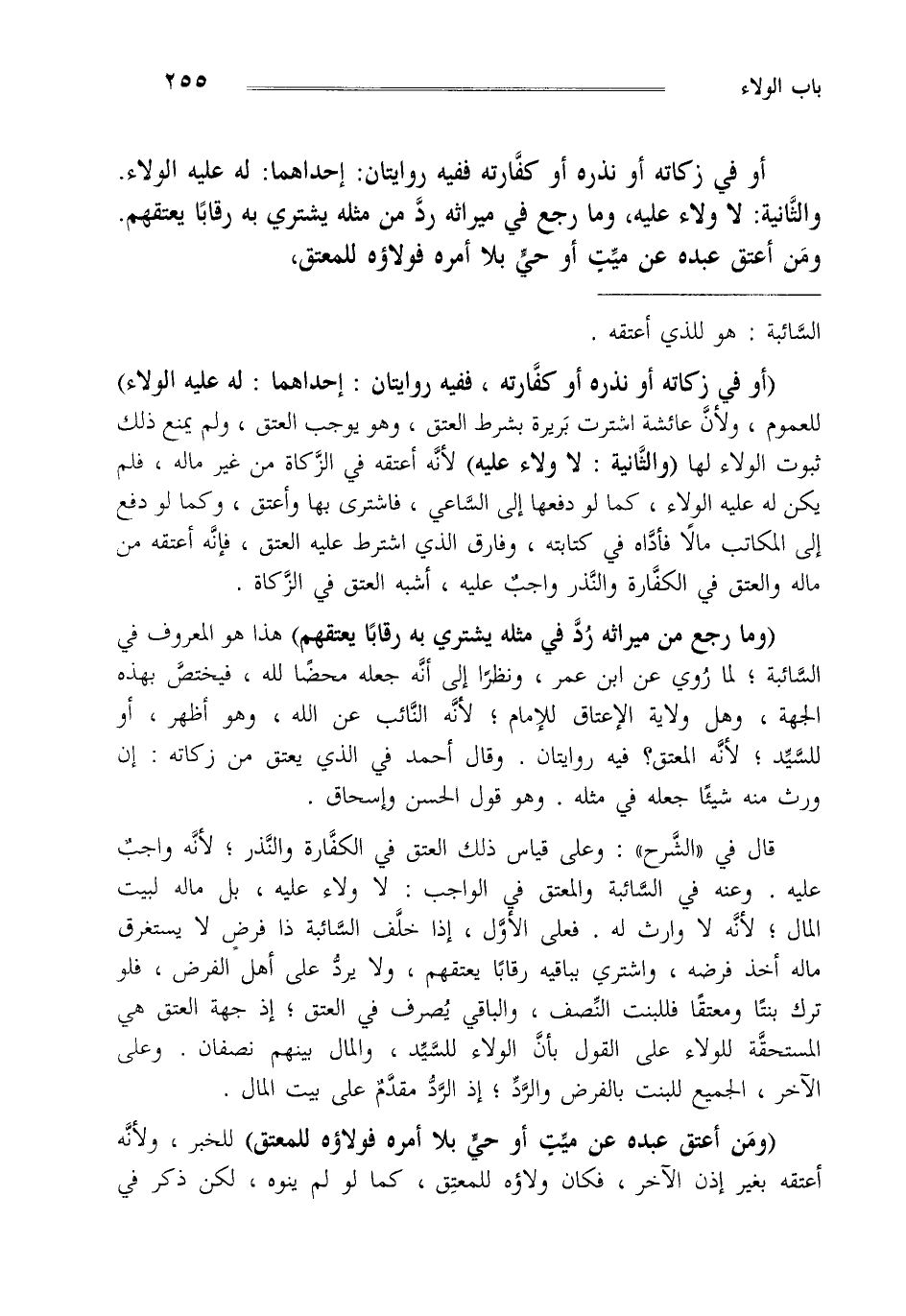 "وما رجع من ميراثه رد في مثله يشتري به رقابا يعتقهم" هذا هو المعروف في السائبة لما روي عن ابن عمر ونظرا إلى أنه جعله محضا لله فيختص بهذه الجهة وهل ولاية الإعتاق للإمام لأنه النائب عن الله وهو أظهر أو للسيد لأنه المعتق فيه روايتان وقال أحمد في الذي يعتق من زكاته إن ورث منه شيئا جعله في مثله وهو قول الحسن وإسحاق.