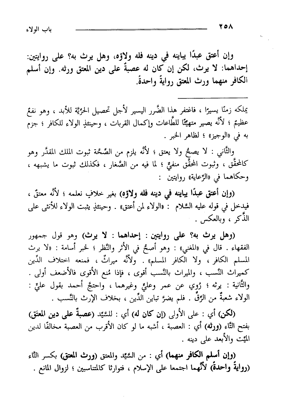 "وهل يرث به؟ على روايتين: إحداهما: لا يرث" وهو قول جمهور الفقهاء قال في المغني وهو أصح في الأثر والنظر لخبر أسامة لا يرث المسلم الكافر ولا الكافر المسلم ولأنه ميراث فمنعه اختلاف الدين كميراث النسب والميراث بالنسب أقوى فإذا منع الأقوى فالأضعف أولى و الثانية: يرثه روي عن عمر وعلي وغيرهما واحتج أحمد بقول علي الولاء شعبة من الرق فلم يضر تباين الدين بخلاف الإرث بالنسب.