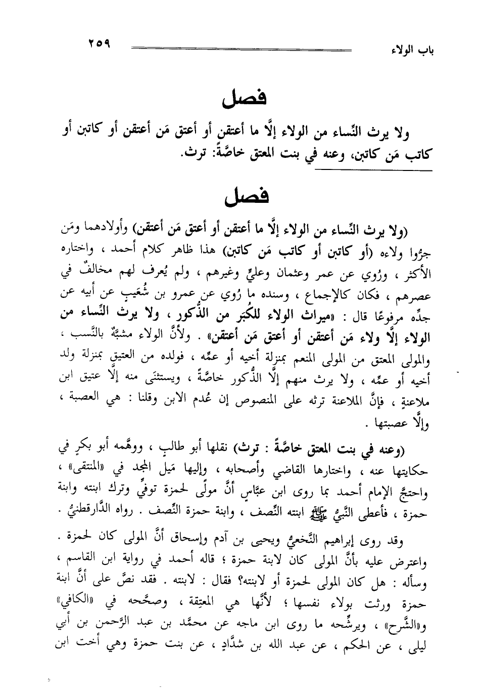 "وعنه: في بنت المعتق خاصة: ترث" نقلها أبو طالب ووهمه أبو بكر في حكايتها عنه واختارها القاضي وأصحابه وإليها ميل المجد في المنتقى واحتج الإمام أحمد بما روى ابن عباس أن مولى لحمزة توفي وترك ابنته وابنة حمزة فأعطى النبي صلى الله عليه وسلم ابنته النصف وابنة حمزة النصف ورواه الدارقطني.
