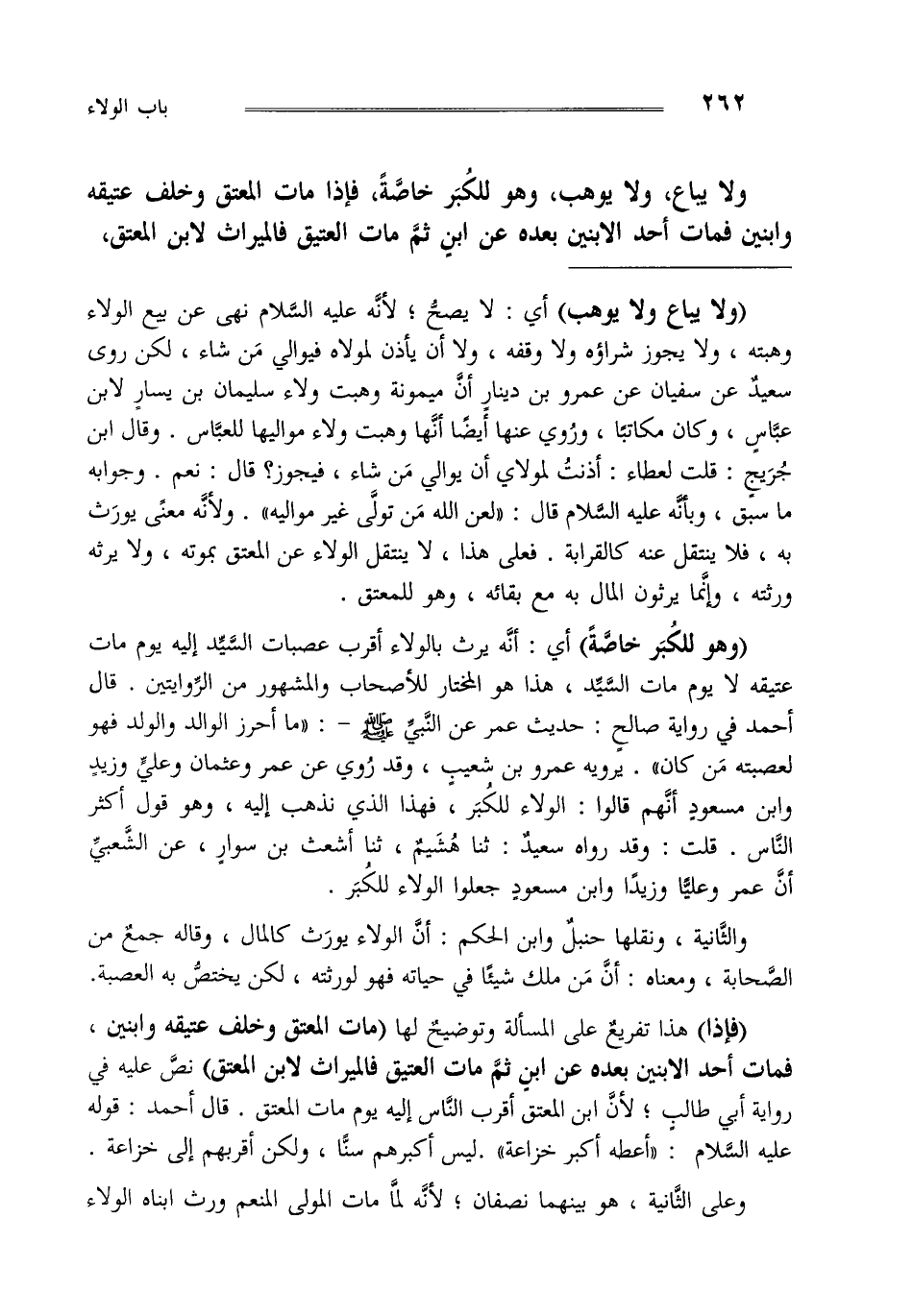 "وهو للكبر خاصة" أي: أنه يرث بالولاء أقرب عصبات السيد إليه يوم مات عتيقه لا يوم مات السيد هذا هو المختار للأصحاب والمشهور من الروايتين قال أحمد: في رواية صالح حديث عمر عن النبي صلى الله عليه وسلم: "ما أحرز الوالد والولد فهو لعصبته من كان" يرويه عمرو بن شعيب وقد روي عن عمر وعثمان وعلي وزيد وابن مسعود أنهم قالوا الولاء للكبر فهذا الذي نذهب إليه وهو قول أكثر الناس قلت: وقد رواه سعيد ثنا هشيم ثنا أشعث بن سوار عن الشعبي أن عمر وعليا وزيدا وابن مسعود جعلوا الولاء للكبر.