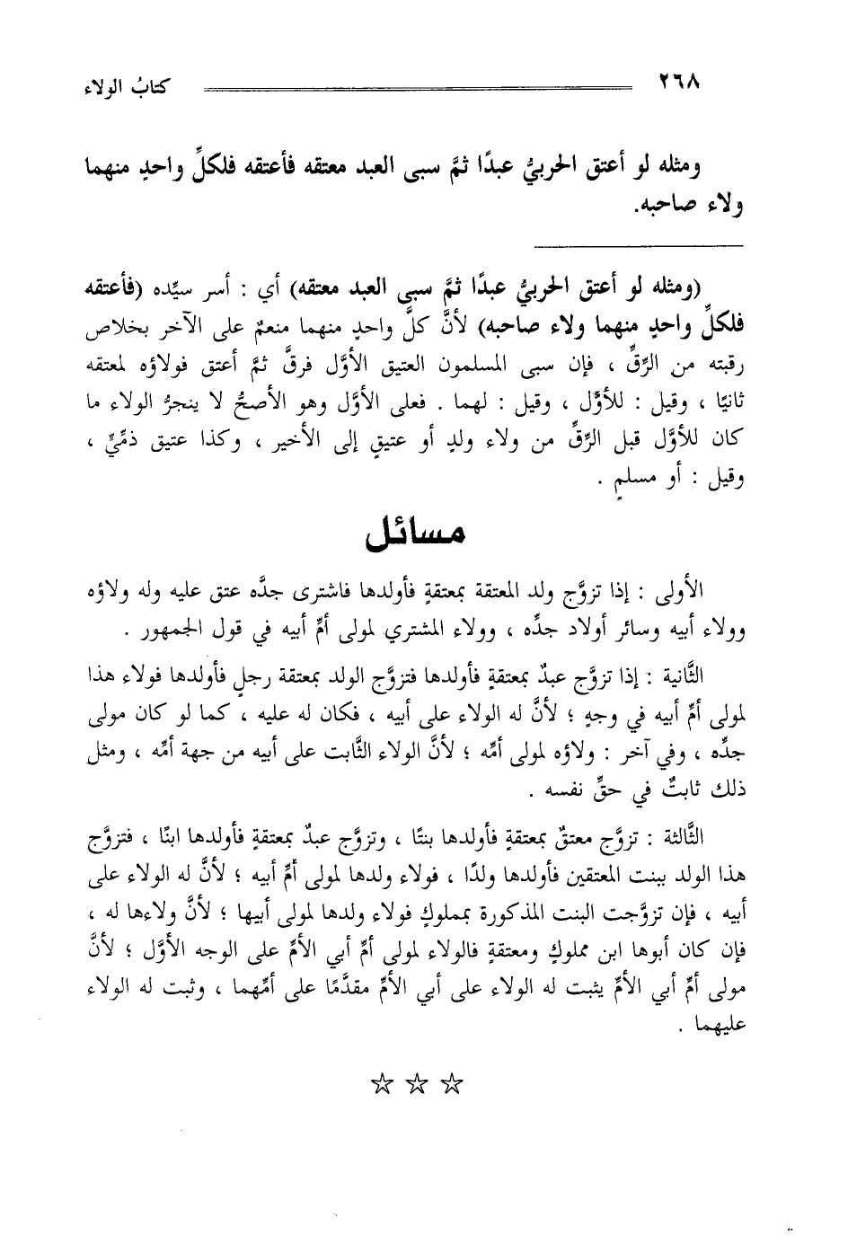 الثالثة : تزوج معتق بمعتقة فأولدها بنتا وتزوج عبد بمعتقة فأولدها ابنا فتزوج هذا الولد ببنت المعتقين فأولدها ولدا فولاء ولدها لمولى أم أبيه لأن له الولاء على أبيه فإن تزوجت البنت المذكورة بمملوك فولاء ولدها لمولى أبيها لأن ولاءها له فإن كان أبوها ابن مملوك ومعتقة فالولاء لمولى أم أبي الأم على الوجه الأول لأن مولى أم أبي الأم يثبت له الولاء على أبي الأم مقدما على أمهما وثبت له الولاء عليهما.