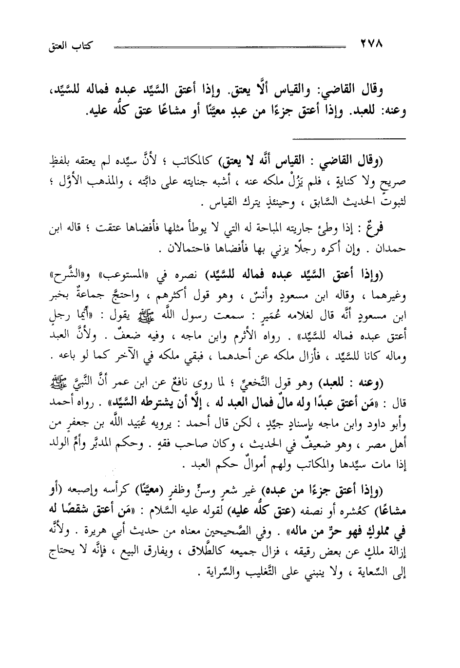 و قال القاضي: والقياس ألا يعتق وإذا أعتق السيد عبده فماله للسيد وعنه: للعبد وإذا أعتق جزءا من عبد معينا أو مشاعا عتق كله عليه.