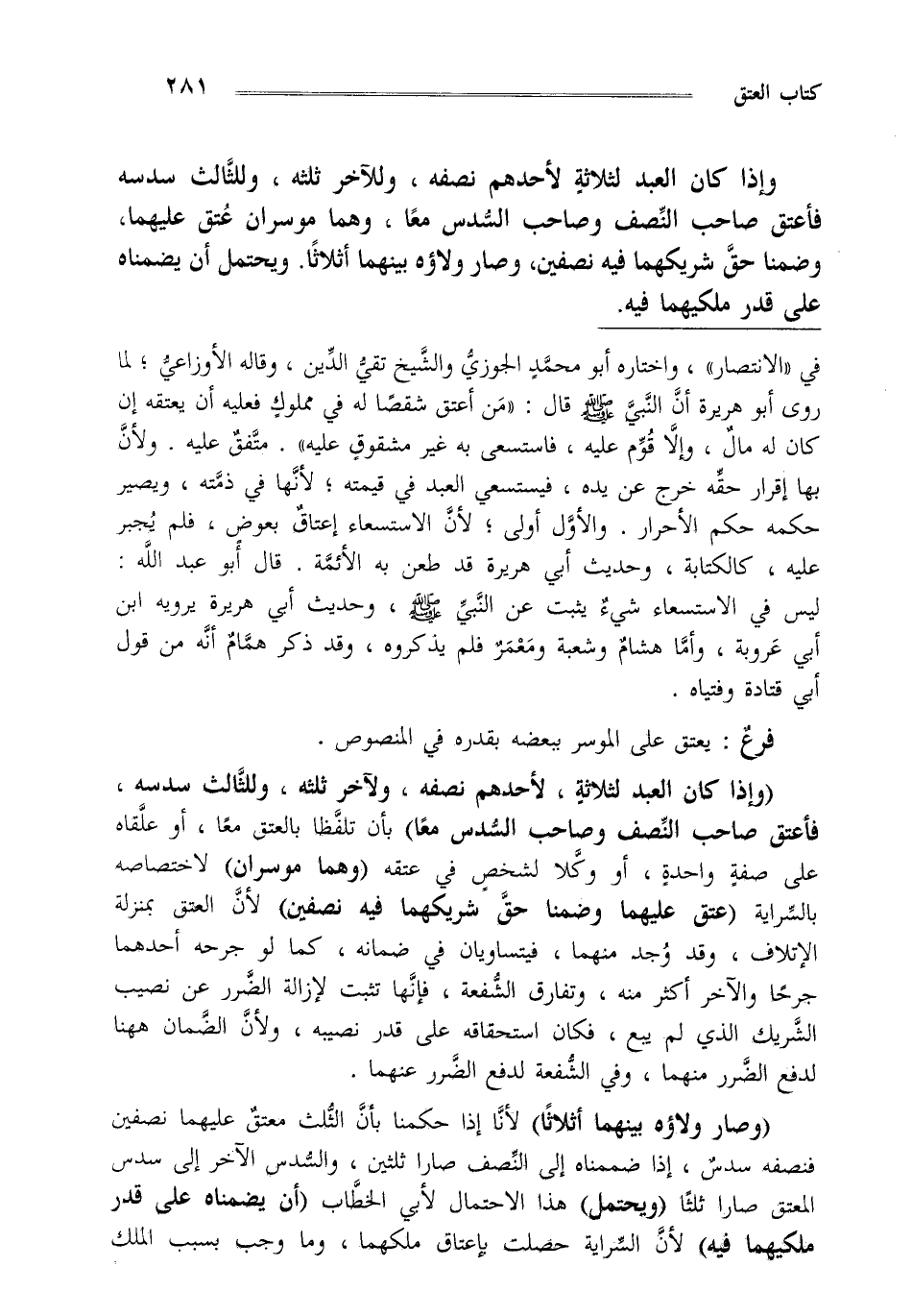 وإذا كان العبد لثلاثة لأحدهم نصفه وللآخر ثلثه وللثالث سدسه فأعتق صاحب النصف وصاحب السدس معا وهما موسران عتق عليهما وضمنا حق شريكهما فيه نصفين وصار ولاؤه بينهما أثلاثا ويحتمل أن يضمناه على قدر ملكيهما فيه.