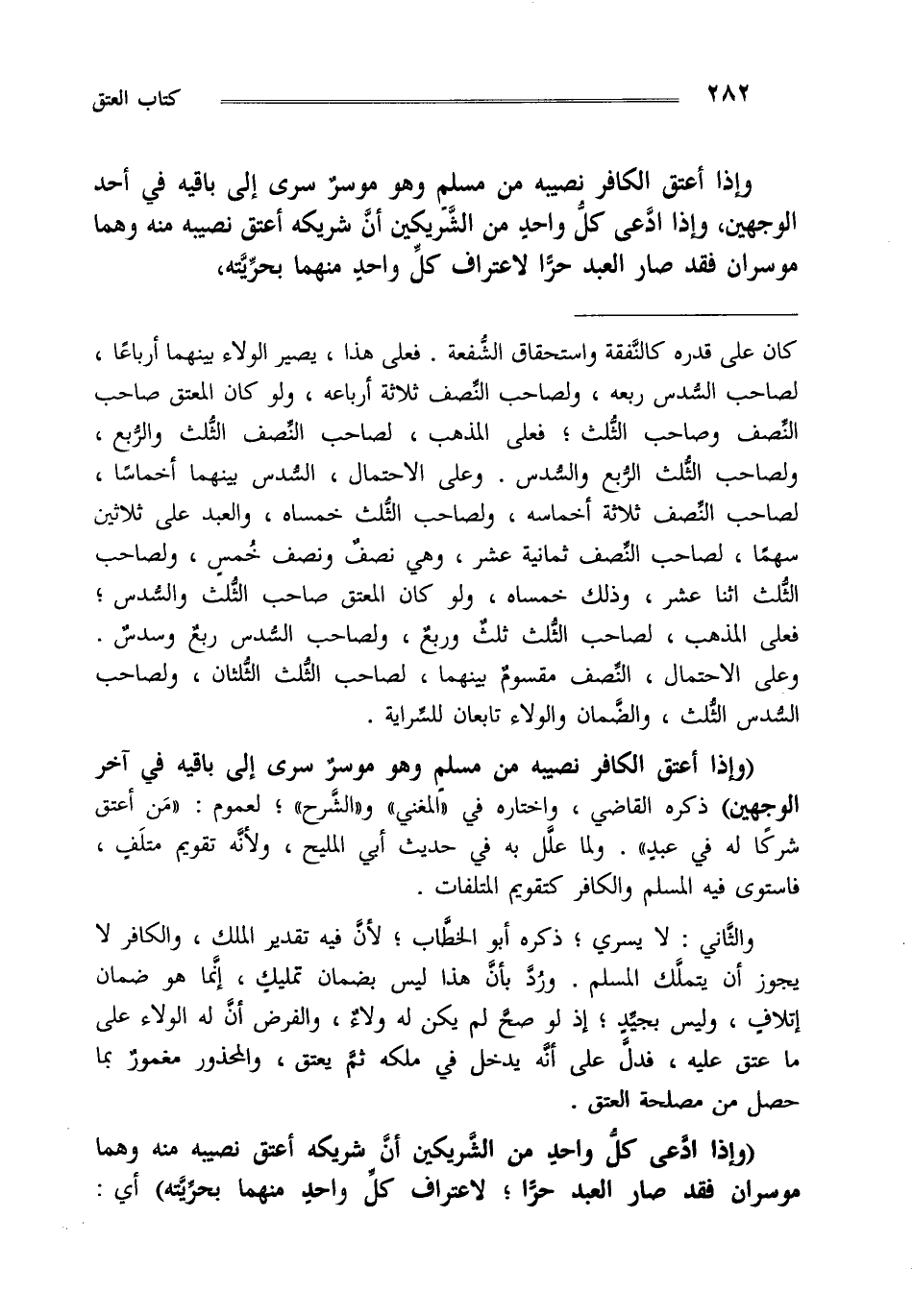 "وإذا أعتق الكافر نصيبه من مسلم وهو موسر سرى إلى باقيه في آخر الوجهين " ذكره القاضي واختاره في المغني والشرح لعموم: "من أعتق شركا له في عبد" ولما علل به في حديث أبي المليح ولأنه تقويم متلف فاستوى فيه المسلم والكافر كتقويم المتلفات.