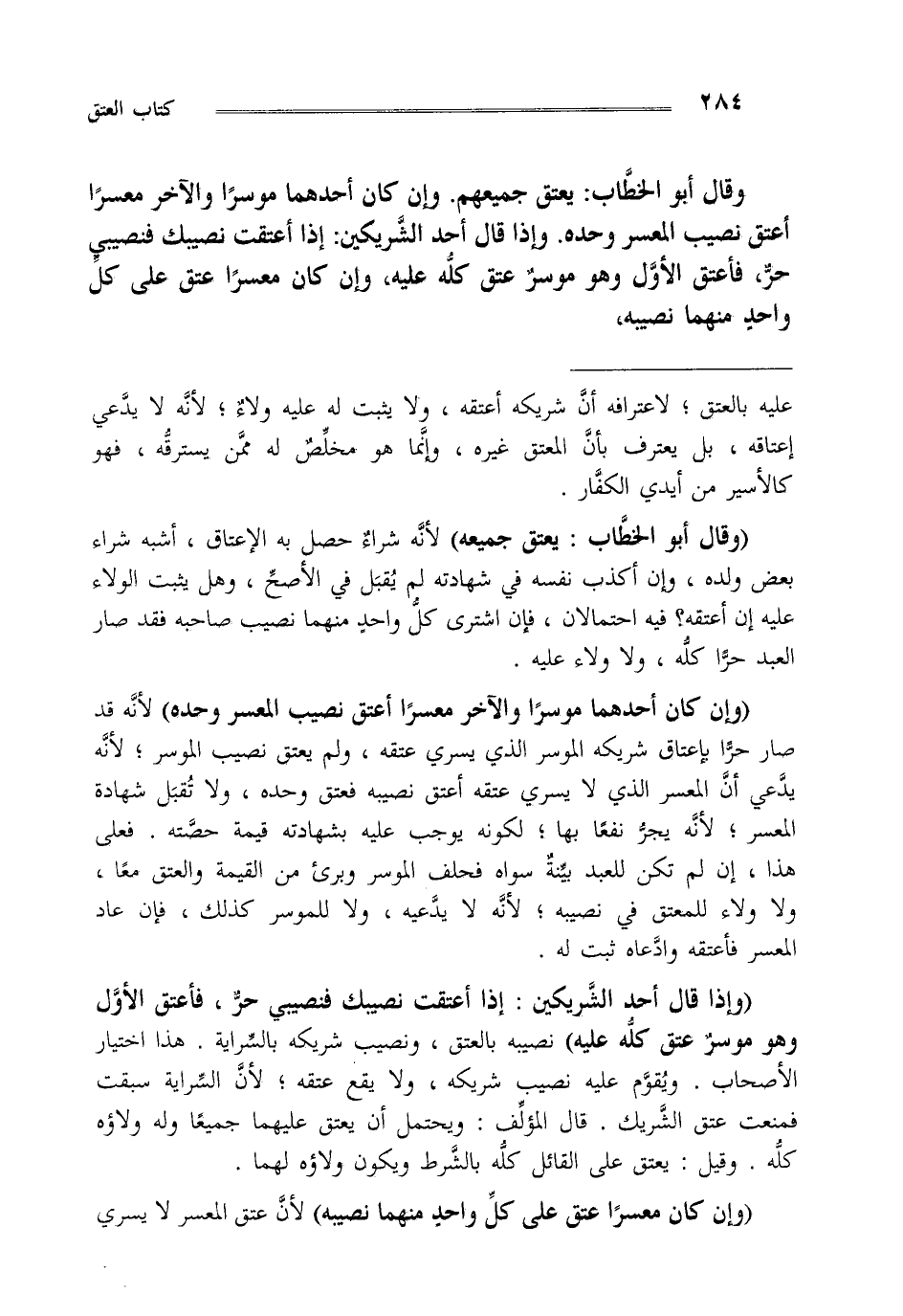 وقال ابو الخطاب: يعتق جميعهم وإن كان أحدهما موسرا والآخر معسرا أعتق نصيب المعسر وحده وإذا قال أحد الشريكين إذا أعتقت نصيبك فنصيبي حر فأعتق الأول وهو موسر عتق كله عليه وإن كان معسرا عتق على كل واحد منهما نصيبه،