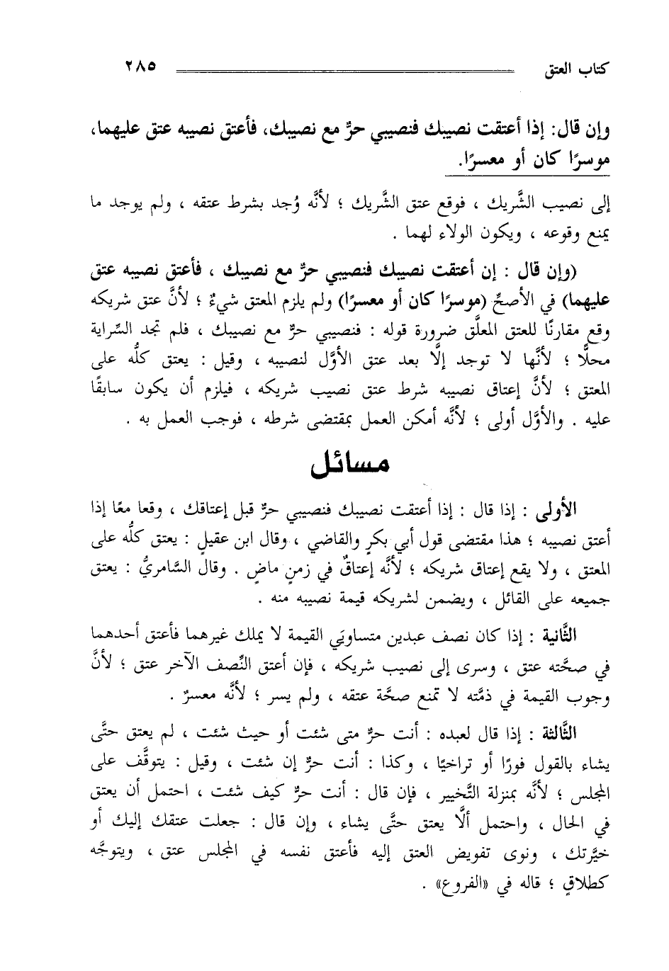 الأولى : إذا قال إذا أعتقت نصيبك فنصيبي حر قبل إعتاقك وقعا معا إذا أعتق نصيبه هذا مقتضى قول أبي بكر والقاضي وقال ابن عقيل يعتق كله على المعتق ولا يقع إعتاق شريكه لأنه إعتاق في زمن ماض وقال السامري يعتق جميعه على القائل ويضمن لشريكه قيمة نصيبه منه.