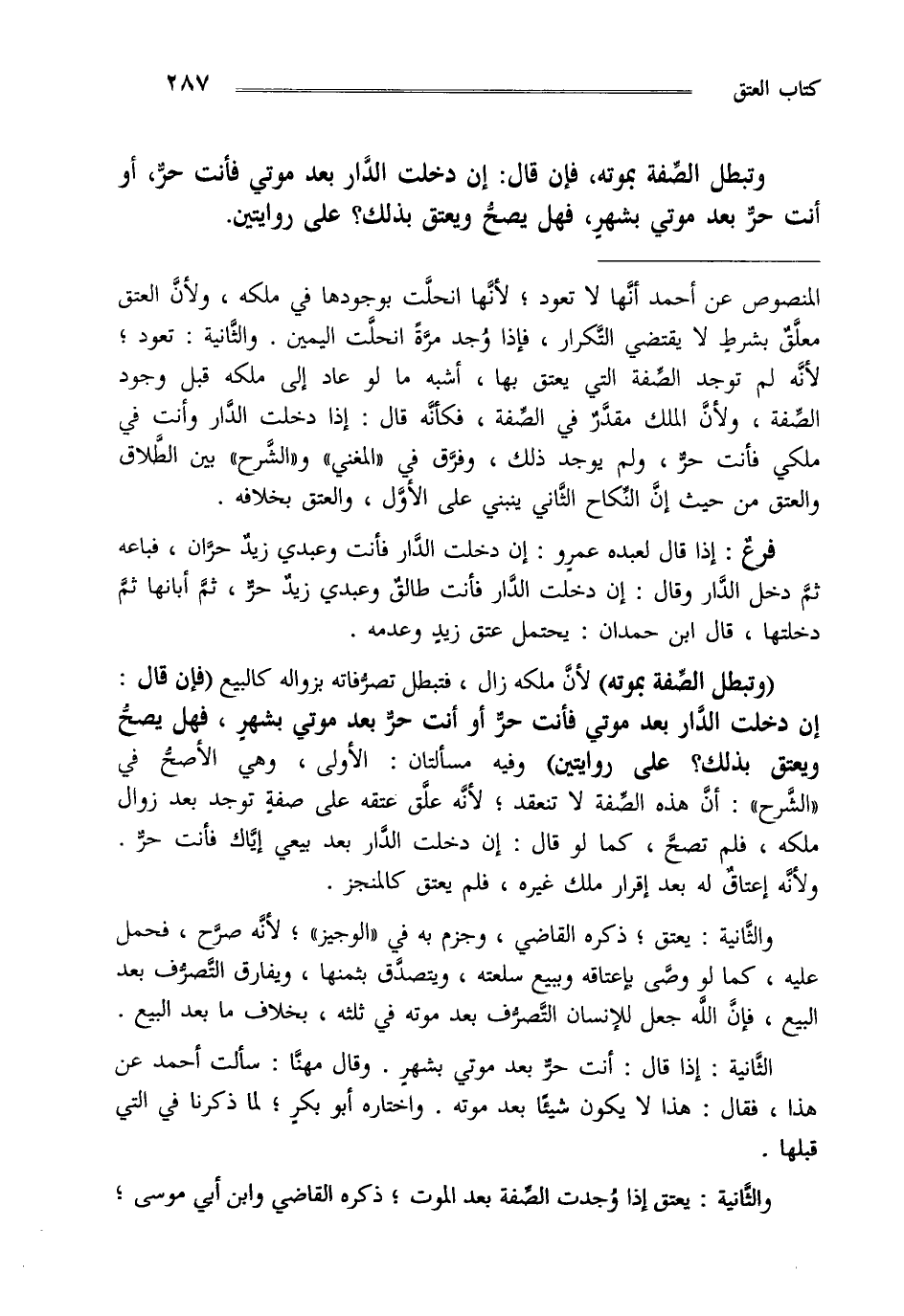 "وتبطل الصفة بموته" لأن ملكه زال فتبطل تصرفاته بزواله كالبيع " فإن قال: إن دخلت الدار بعد موتي فأنت حر أو أنت حر بعد موتي بشهر فهل يصح ويعتق بذلك؟ على روايتين" وفيه مسألتان الأولى وهي الأصح في الشرح أن هذه الصفة لا تنعقد لأنه علق عتقه على صفة توجد بعد زوال ملكه فلم تصح كما لو قال: إن دخلت الدار بعد بيعي إياك فأنت حر ولأنه إعتاق له بعد إقرار ملك غيره فلم يعتق كالمنجز.
