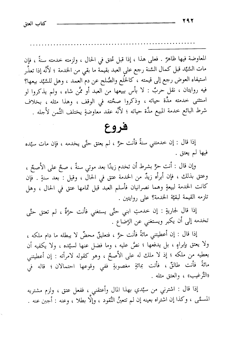 المعاوضة فيها ظاهر فعلى هذا إذا قبل عتق في الحال ولزمته خدمته سنة فإن مات السيد قبل كمال السنة رجع على العبد بقيمة ما بقي من الخدمة لأنه إذا تعذر استيفاء العوض رجع إلى قيمته كالخلع والصلح عن دم العبد وهل للسيد بيعها فيه روايتان نقل حرب لا بأس ببيعها من العبد أو ممن شاء ولم يذكروا لو استثنى خدمته مدة حياته وذكروا صحته في الوقف وهذا مثله بخلاف شرط البائع خدمة المبيع مدة حياته لأنه عقد معاوضة يختلف الثمن لأجله.