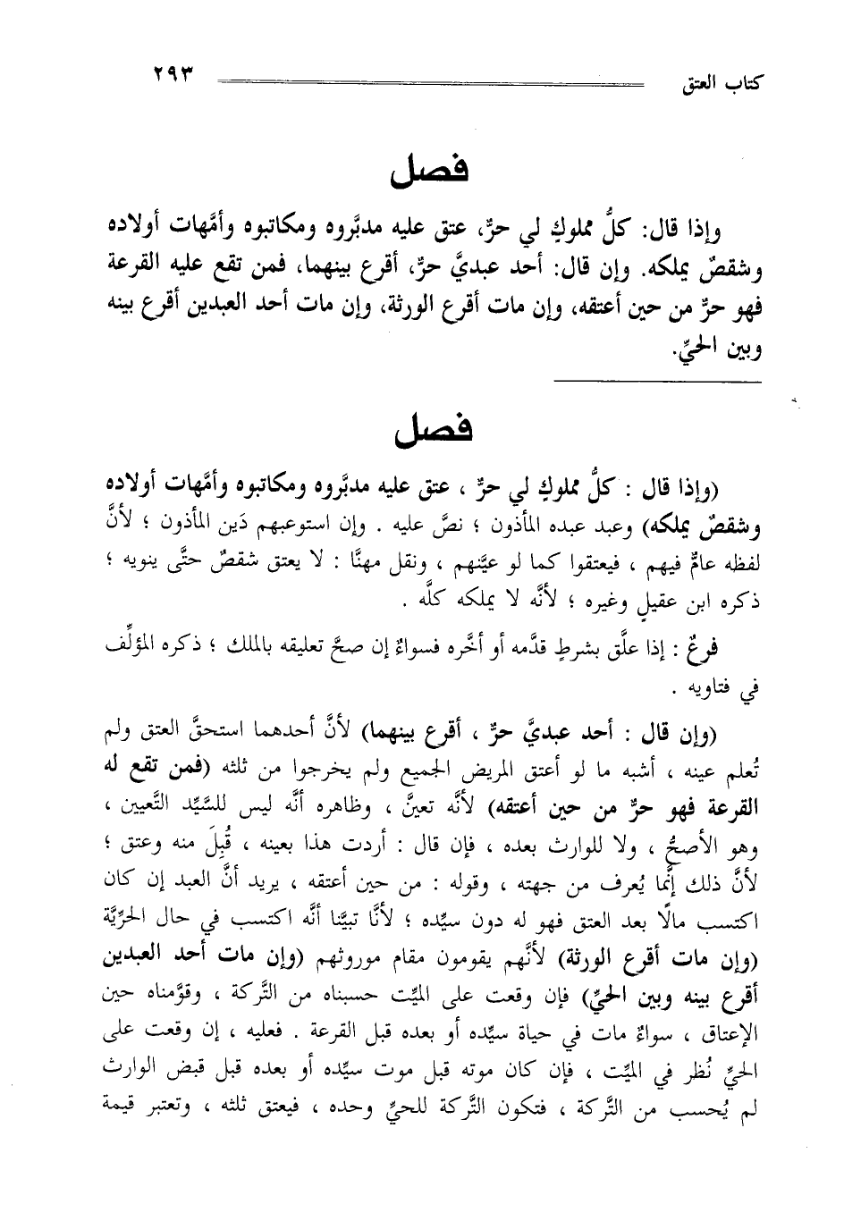 "وإذا قال: كل مملوك لي حر عتق عليه مدبروه ومكاتبوه وأمهات أولاده وشقص يملكه " وعبد عبده المأذون نص عليه وإن استوعبهم دين المأذون لأن لفظه عام فيهم فيعتقوا كما لو عينهم ونقل مهنا لا يعتق شقص حتى ينويه ذكره ابن عقيل وغيره لأنه لا يملكه كله. فرع: إذا علق بشرط قدمه أو أخره فسواء إن صح تعليقه بالملك ذكره المؤلف في فتاويه. "وإن قال: أحد عبدي حر أقرع بينهما" لأن أحدهما استحق العتق ولم يعلم عينه أشبه ما لو أعتق المريض الجميع ولم يخرجوا من ثلثه "فمن تقع له القرعة فهو حر من حين أعتقه" لأنه تعين وظاهره: أنه ليس للسيد التعيين وهو الأصح ولا للوارث بعده فإن قال: أردت هذا بعينه قبل منه وعتق لأن ذلك إنما يعرف من جهته وقوله من حين أعتقه يريد أن العبد إن كان اكتسب مالا بعد العتق فهو له دون سيده لأنا تبينا أنه اكتسب في حال الحرية "وإن مات أقرع الورثة" لأنهم يقومون مقام موروثهم "وإن مات أحد العبدين أقرع بينه وبين الحي" فإن وقعت على الميت حسبناه من التركة وقومناه حين الإعتاق سواء مات في حياة سيده أو بعده قبل القرعة فعليه إن وقعت على الحي نظر في الميت فإن كان موته قبل موت سيده أو بعده قبل قبض الوارث لم يحسب من التركة فتكون التركة للحي وحده فيعتق ثلثه وتعتبر قيمة