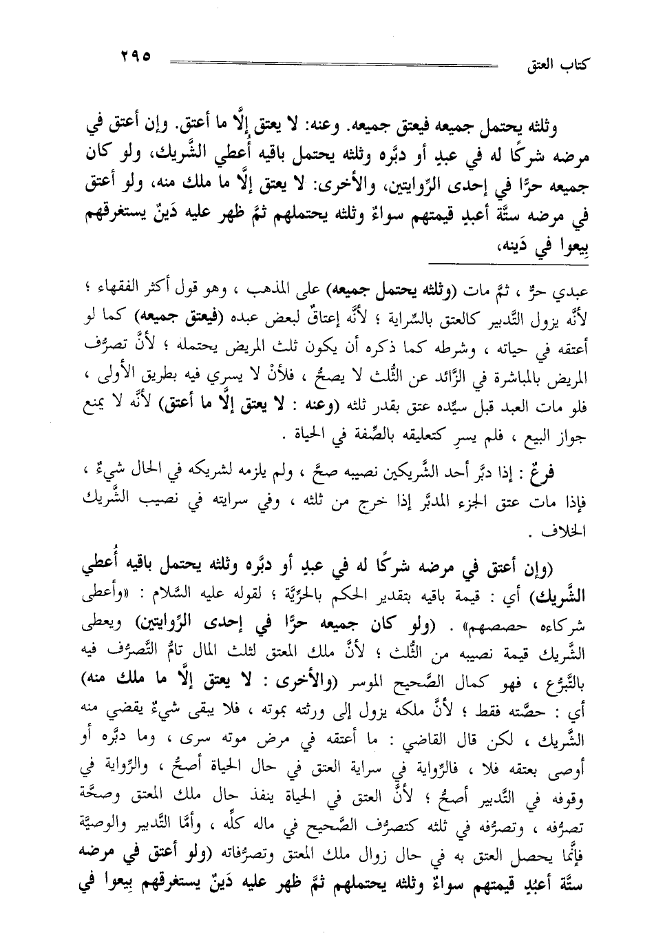 وثلثه يحتمل جميعه فيعتق جميعه وعنه: لا يعتق إلا ما أعتق وإن أعتق في مرضه شركا له في عبد أو دبره وثلثه يحتمل باقيه أعطي الشريك ولو كان جميعه حرا في إحدى الروايتين و الأخرى لا يعتق إلا ما ملك منه ولو أعتق في مرضه ستة أعبد قيمتهم سواء وثلثه يحتملهم ثم ظهر عليه دين يستغرقهم بيعوا في دينه،