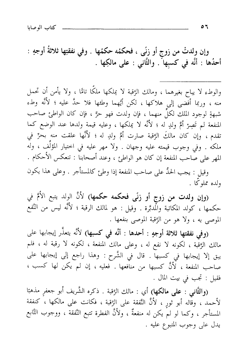وقيل: يجب الحد على صاحب المنفعة إذا وطىء كالمستأجر وعلى هذا يكون ولده مملوكا. "وإن ولدت من زوج أو زنى فحكمه حكمها" لأن الولد يتبع الأم في حكمها كولد المكاتبة والمدبرة وقيل: هو لمالك الرقبة لأنه ليس من النفع الموصى به ولا هو من الرقبة الموصى بنفعها.